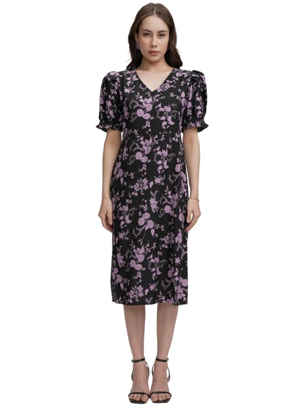 Tokyo Talkies Women's Floral Midi Dress | A-line| V-Neck | Short Puff Sleeves & Playful Silhouette | Chic & Effortlessly Feminine by Prixsa.com
