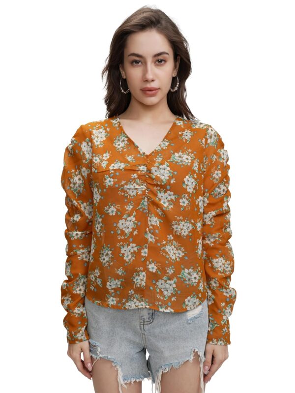 Tokyo Talkies Women's Floral V-Neck | Front Gather | Long Gathered Sleeves Top | Tops for Woman | Women Tops | Stylish Top by Prixsa.com