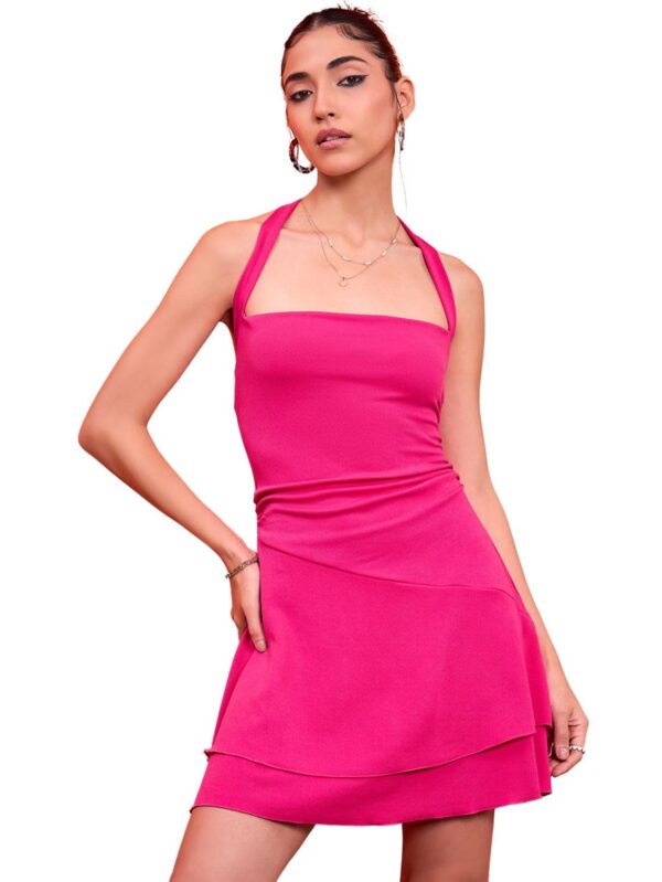 Uptownie Draped Collar Double Layer Ruffle Halter Neck Ruched Dress by Prixsa.com