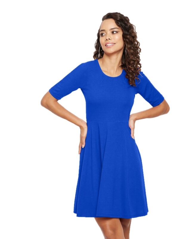 This stretchable round neck 3/4th sleeves skater dress is super comfortable. It is a basic dress which will become your wardrobe staple and can be worn from day to night.