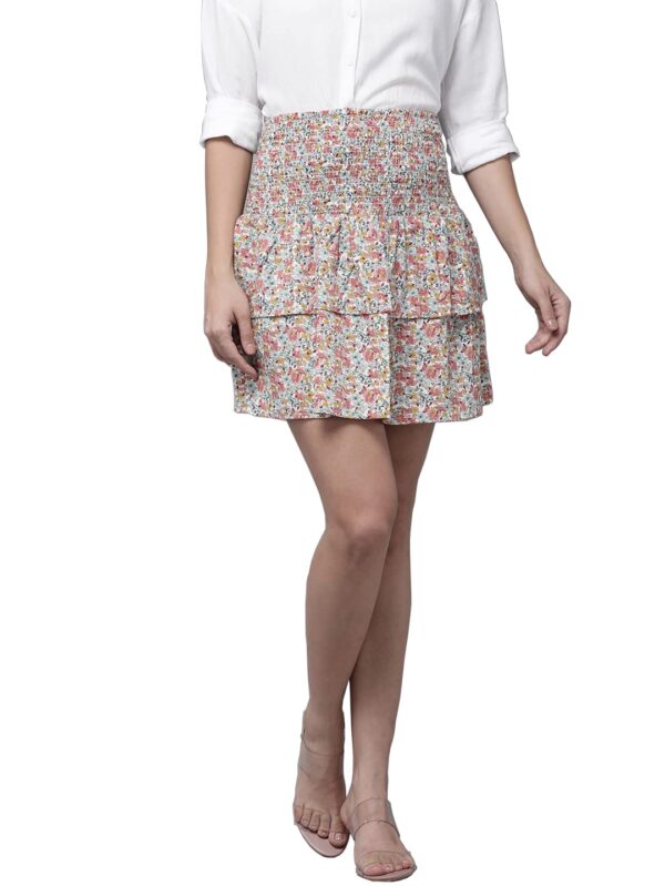 Step into the season with this Front Button Printed Ruffled Skirt, a delightful blend of color, comfort, and feminine flair. Featuring a charming pastel green base with vibrant multicolored floral prints, this skirt is designed to brighten up your wardrobe effortlessly.