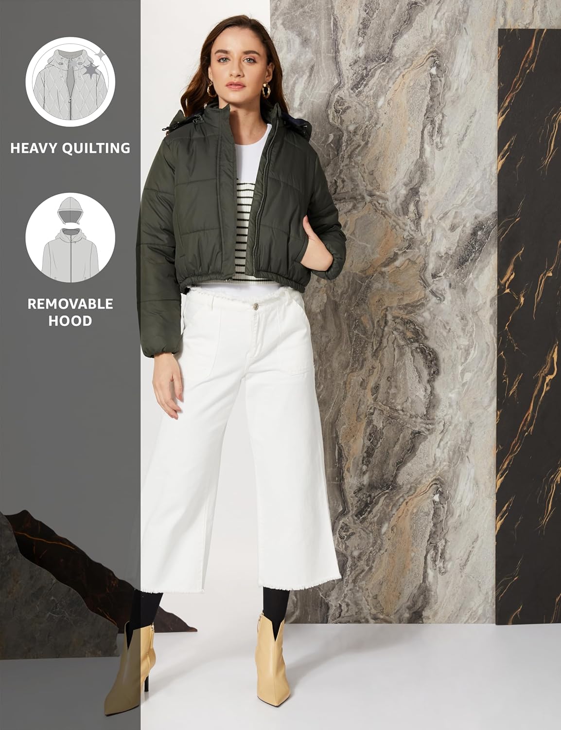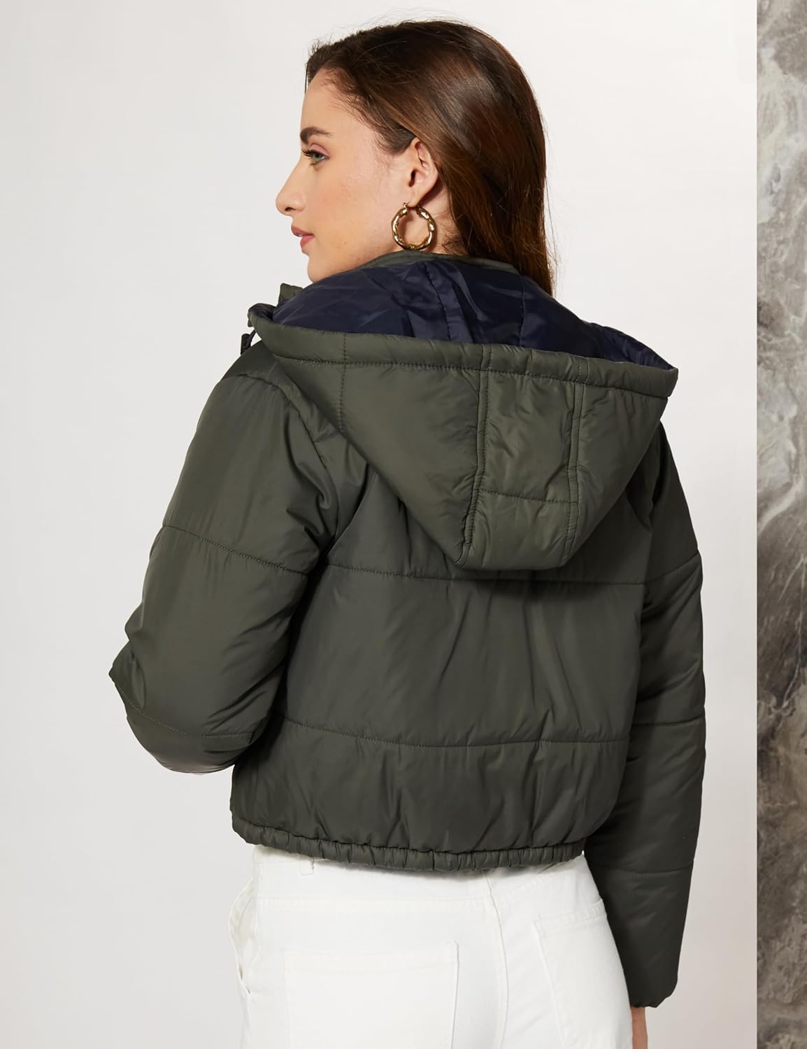 Generic Name : Polyester Regular Fit Cropped Length Quilted Jacket With Detachable Hoodie (Puffer Jackets)