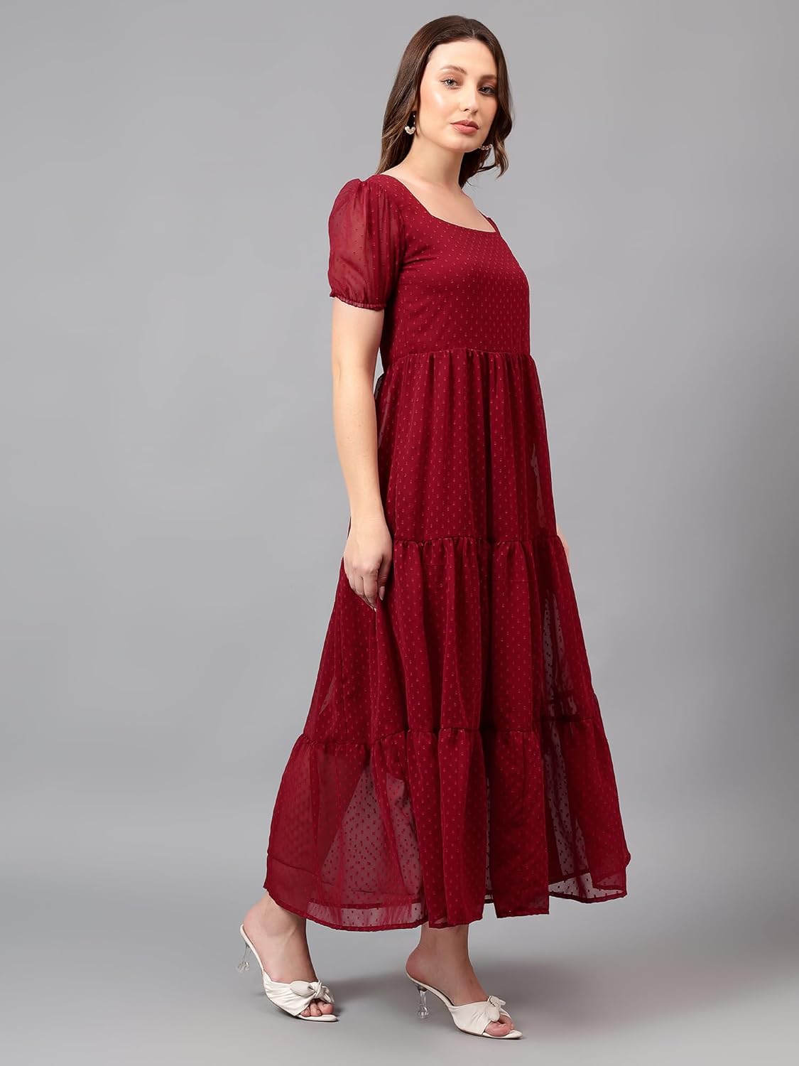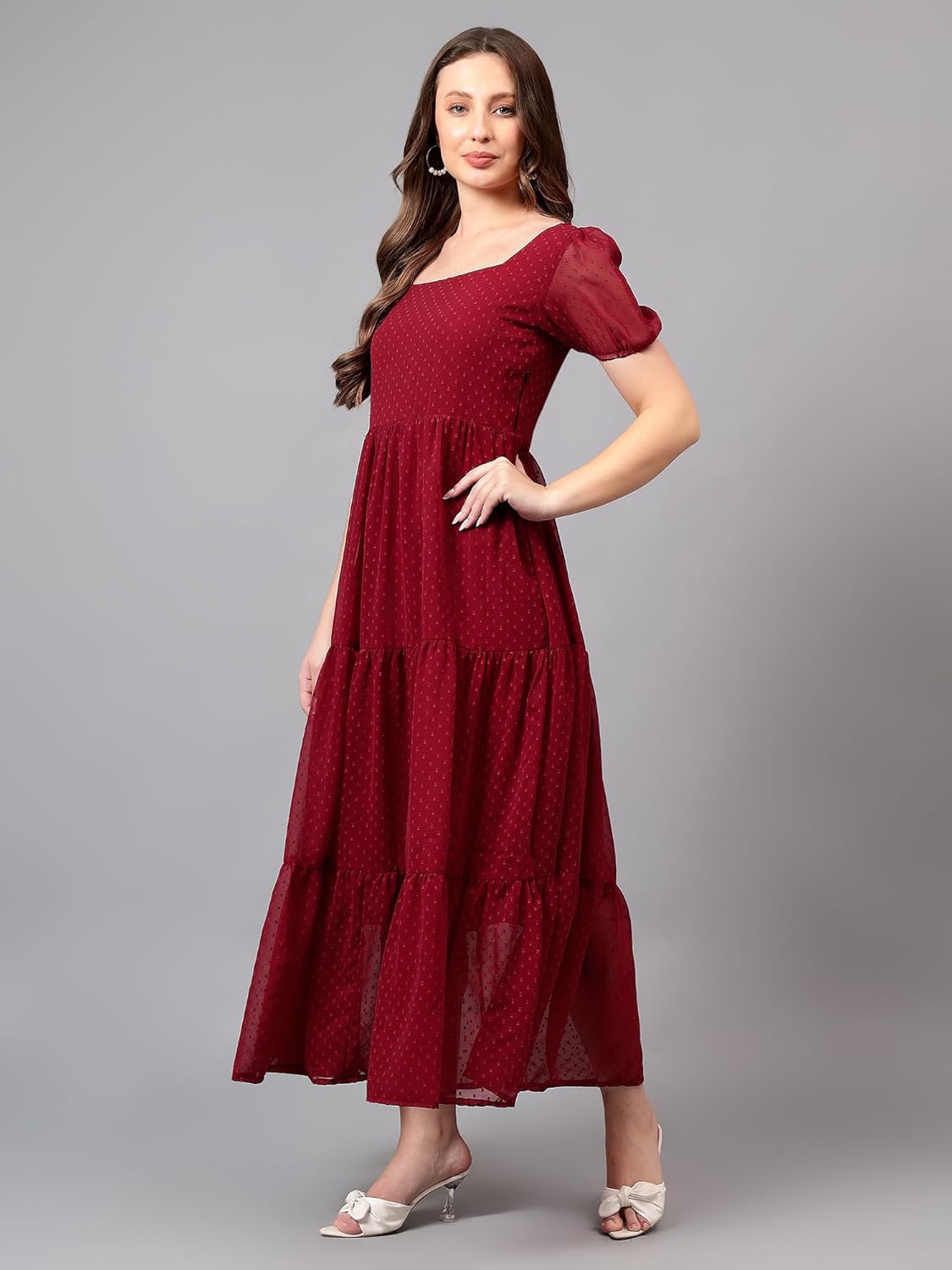 Experience the epitome of elegance with this stunning dress for women. Crafted from exquisite fabric, this party wear western dress features a flattering silhouette with an empire waistline and a tiered skirt that flows gracefully to the ankle length. The delicate lace detailing on the puffed sleeves and the bodice adds a touch of romance, while the scoop neckline exudes sophistication. Whether you’re attending a formal event or a festive gathering, this dress will make you the centre of attention. Its versatile design allows you to style it with heels or flats, creating a look that’s both chic and comfortable. With its timeless appeal and impeccable craftsmanship, this dress is a must-have addition to your wardrobe. Please note that the measurements provided are in metric units.