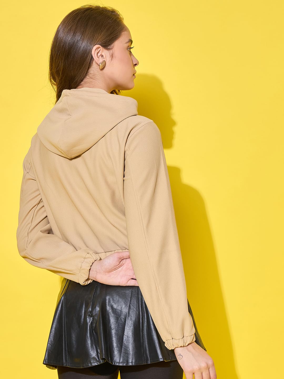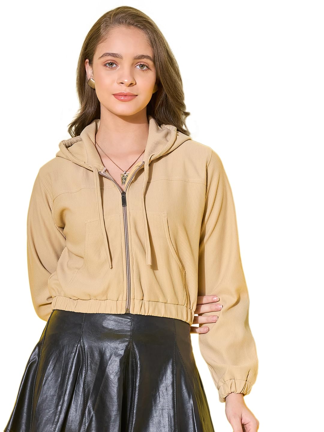 This women’s cotton ribbed short casual hoodie jacket is perfect for laid-back style. It features front pockets for convenience, a secure zipper closure, and an adjustable drawstring hoodie for a snug fit. The soft cotton ribbed fabric ensures comfort, making it an ideal choice for everyday wear or casual outings. The model (height 5’8) is wearing a size M. Size Chart In Inches – Size : S “Bust 38 Length 17” Size : M “Bust 40 Length 18” Size : L “Bust 42 Length 19”