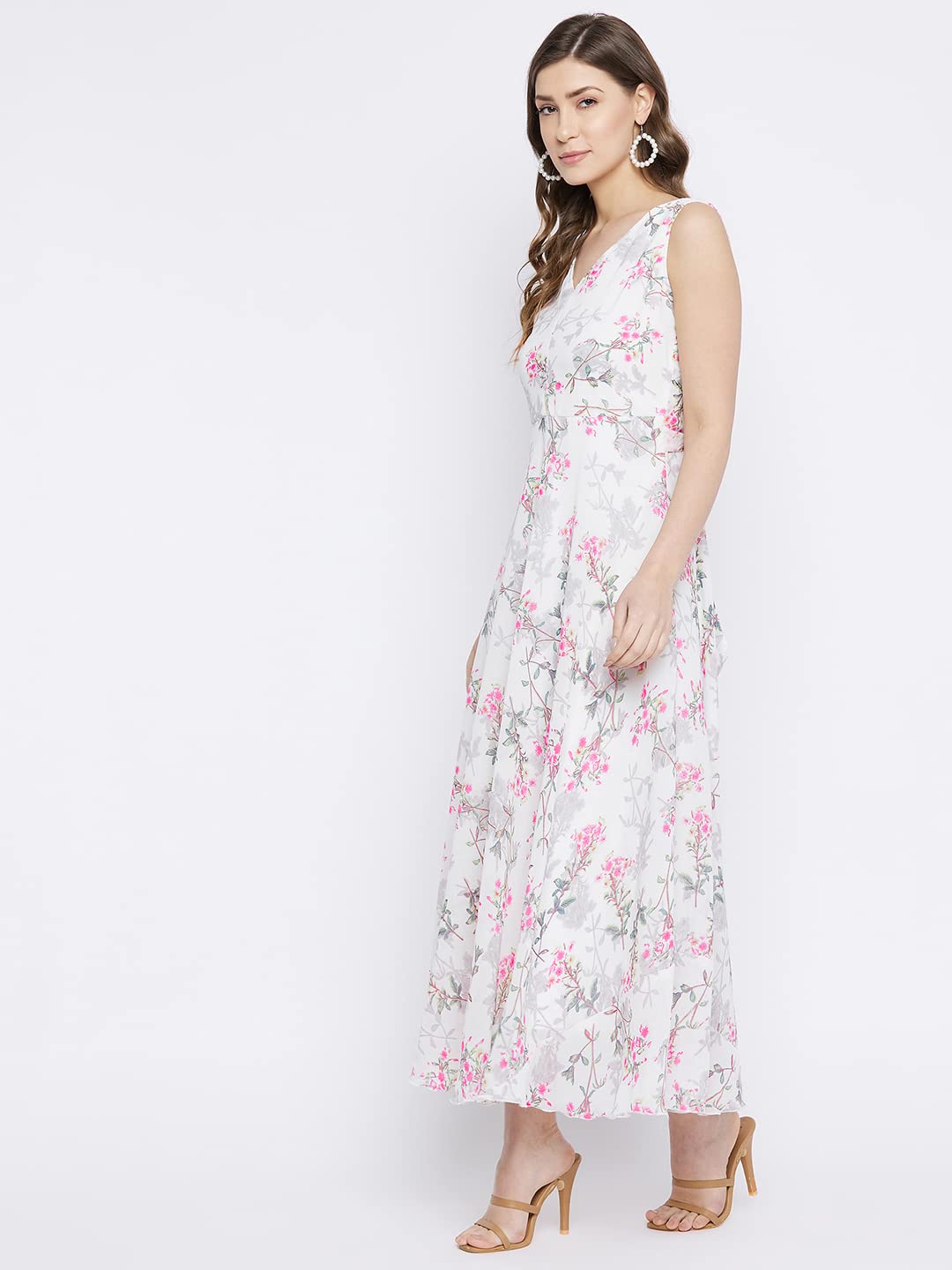 HELLO DESIGN V-neck sleeveless regular fit maxi dress. All over floral print dress with drawstring attached for best fit. Made of Georgette fabric with cotton lining. Suitable for party-wear, casual and festive. Gift-able for marriage and outings.