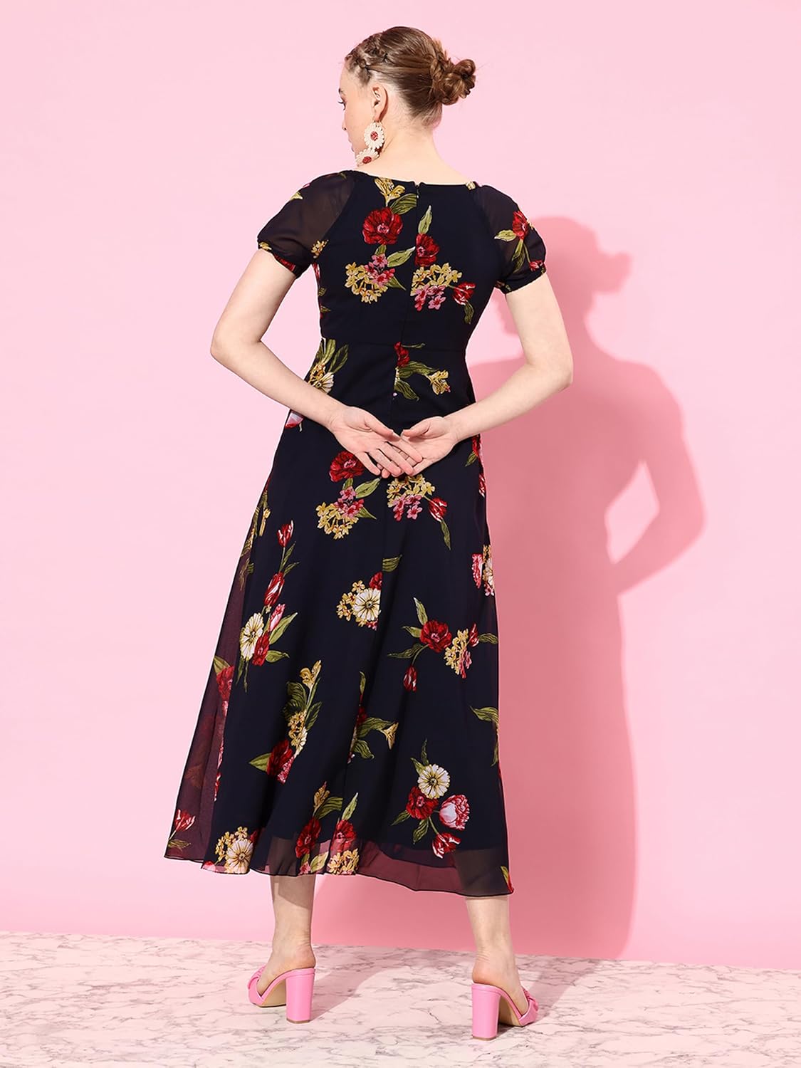 Miss Chase Women’s Square Neck Short Puff Sleeve Floral Fit & Flare Georgette Midi Dress with Pockets by Prixsa.com