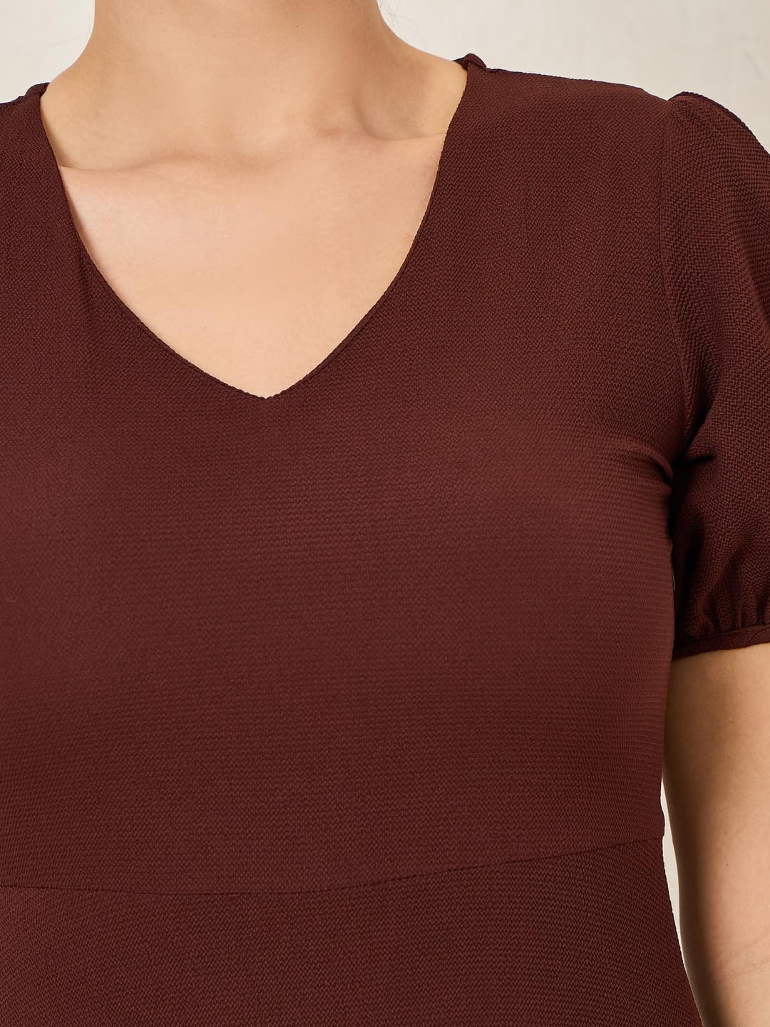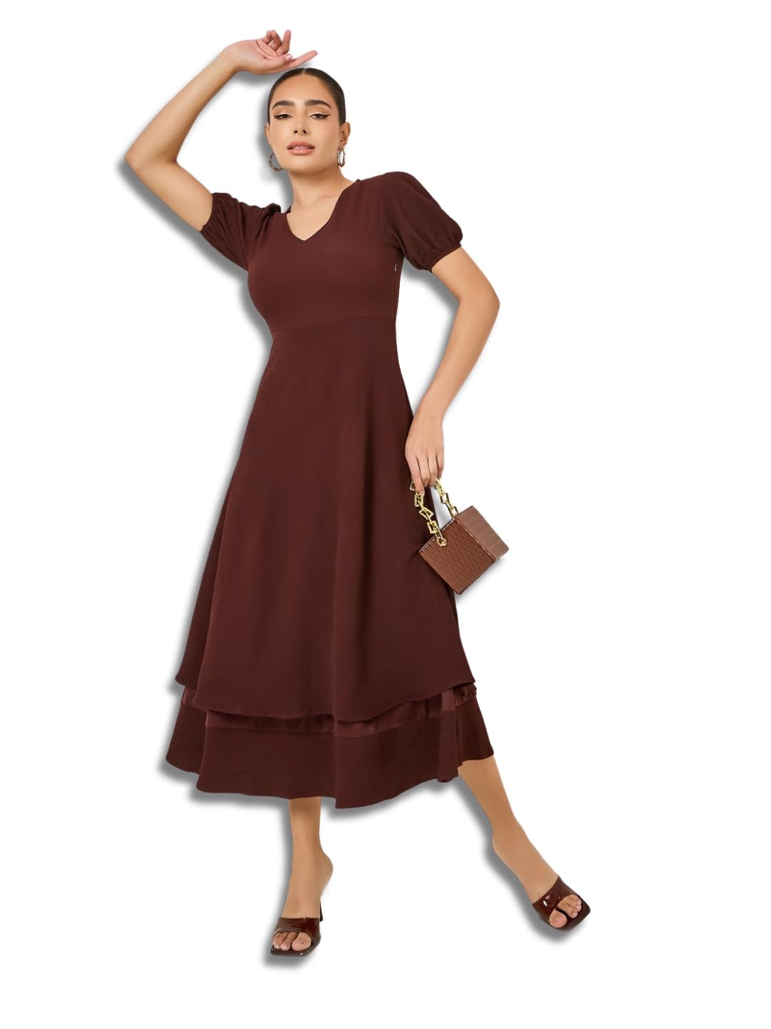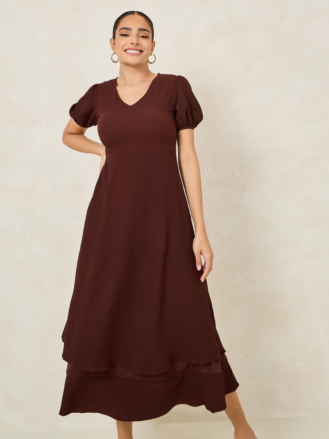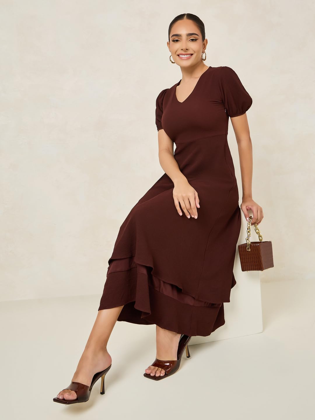 Elevate your style with the stunning Styli Women Brown V Neck Layered Maxi Dress. Crafted from luxurious polyester, this dress is perfect for any party. The A-line silhouette flatters your figure while the V-neck adds a touch of sophistication. With its solid color and layered design, this dress exudes elegance. Featuring a convenient zip closure, short puff sleeves, and a maxi-length straight hemline, it offers both style and comfort. Made from durable woven fabric and machine washable for easy care, this dress is a versatile choice for any occasion.