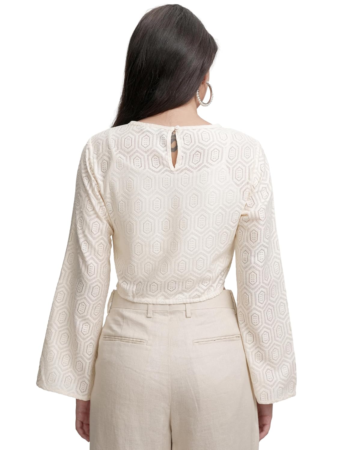 Tokyo Talkies Bell Sleeve Crop Crochet Top | Closed Round Neck | Chic & Bohemian | Perfect For Festivals, Vacations & Casual Outings | Tops For Woman | Women Tops
