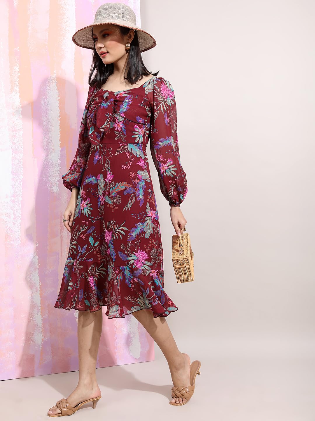 Tokyo Talkies Women Elegant Floral A-Line Dress | Long Puff Sleeves & Ruffle hem for a Feminine Touch | bow tie up