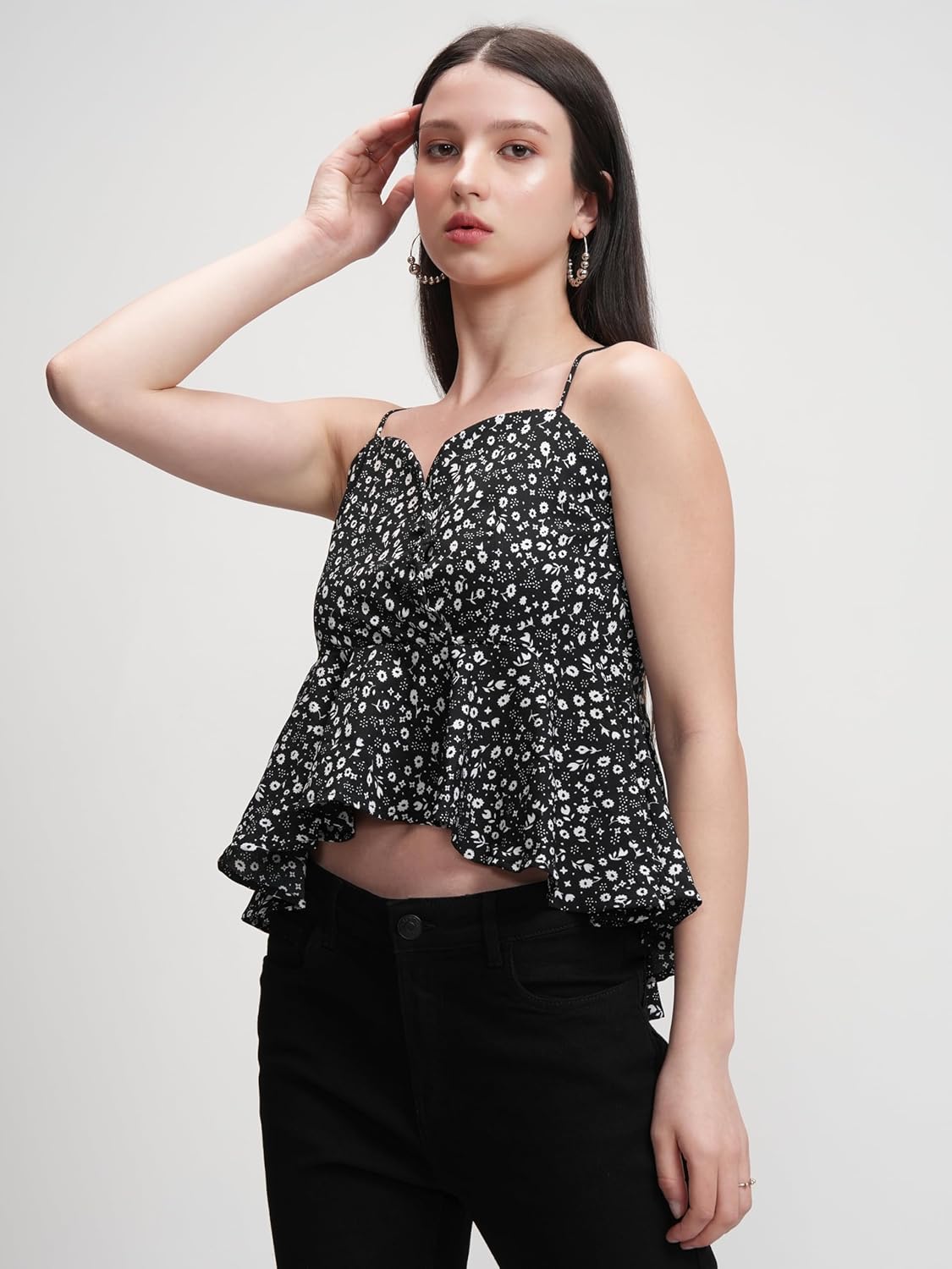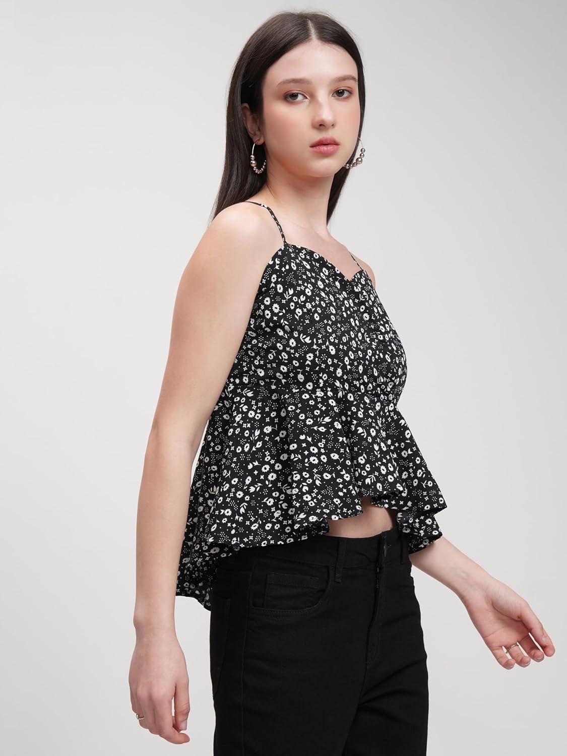 Tokyo Talkies Floral Peplum Top | Shoulder Straps | Flirty & Feminine | Perfect For Day Outings & Brunches | Tops For Woman | Women Tops