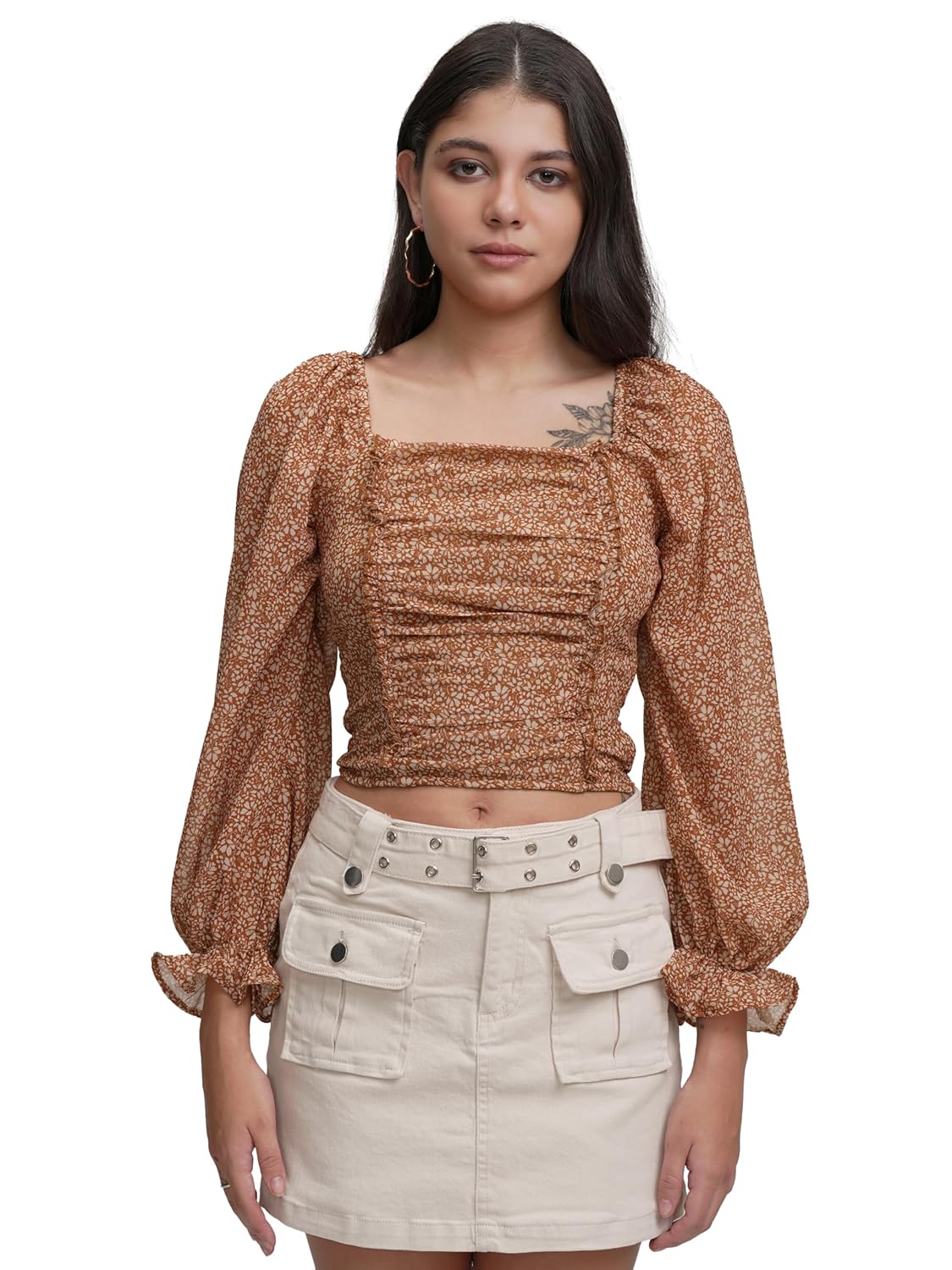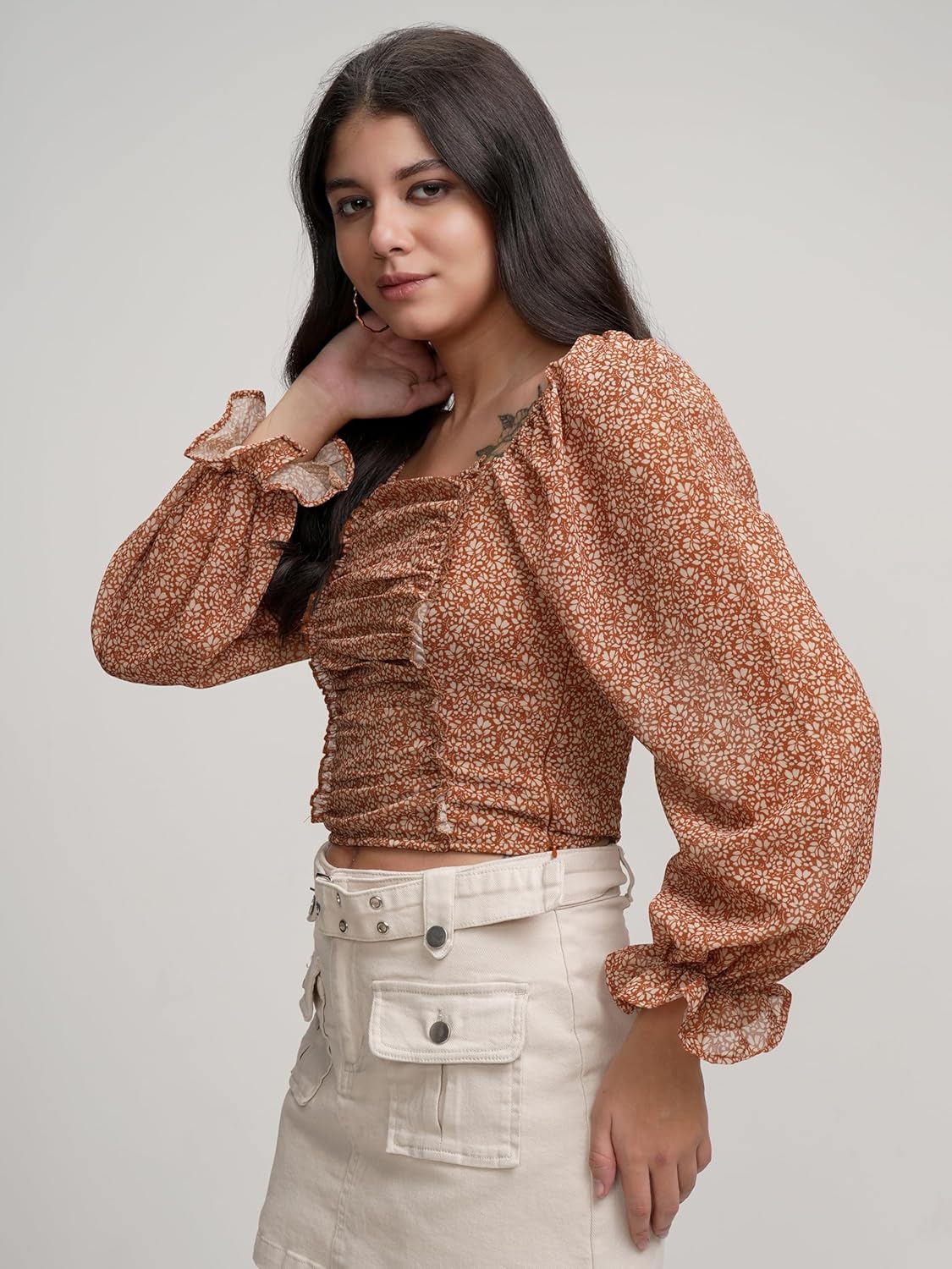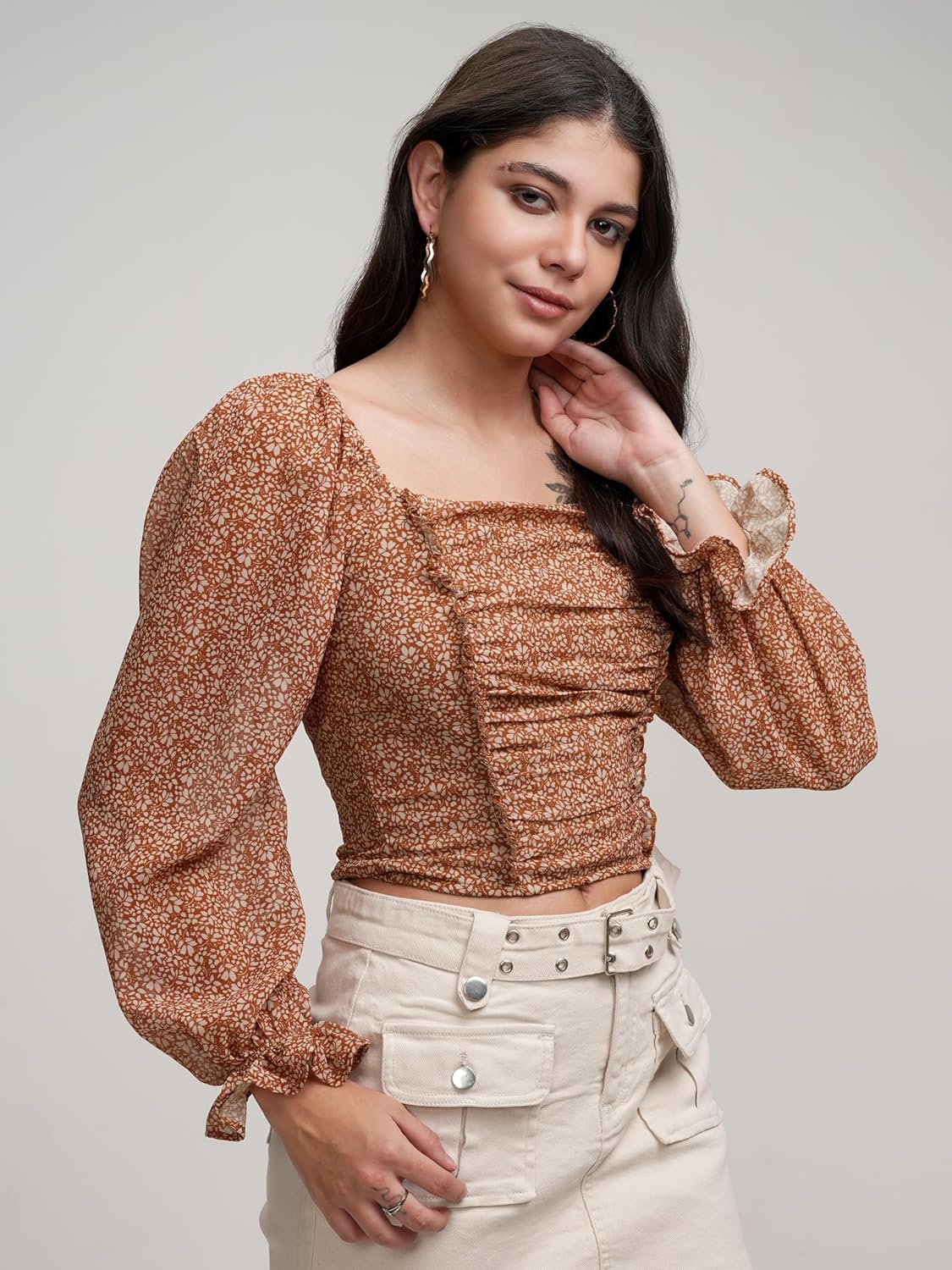 Tokyo Talkies Floral Printed Square Neck Top | Front Ruching | Long Puff Sleeves | Chic & Feminine | Perfect For Brunch, Dates | Tops For Woman | Women Tops