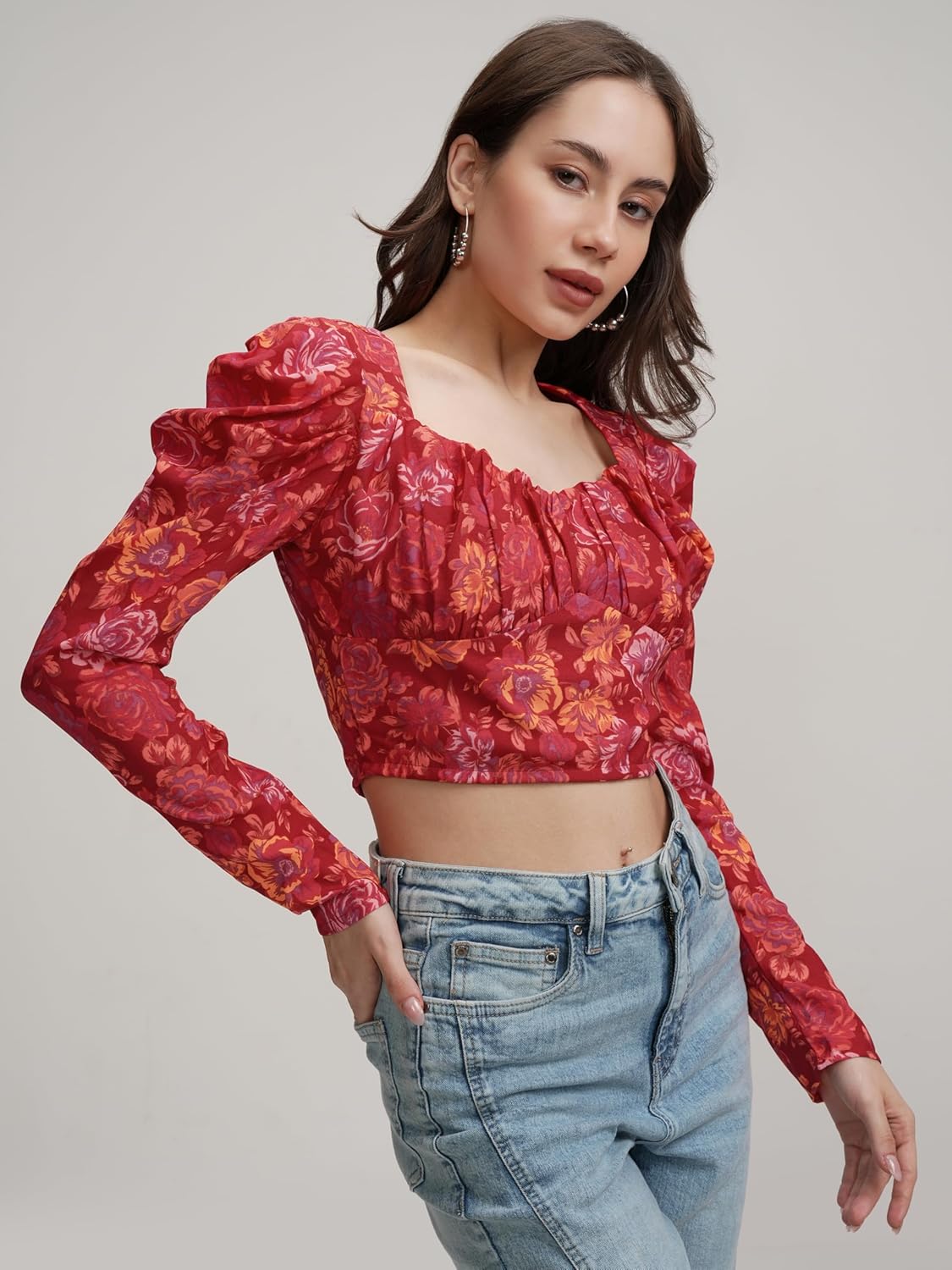 Tokyo Talkies Floral Ruched Crop Top | Trendy Fitted Design With Vibrant Pink Print For A Chic Look | Tops For Woman | Women Tops