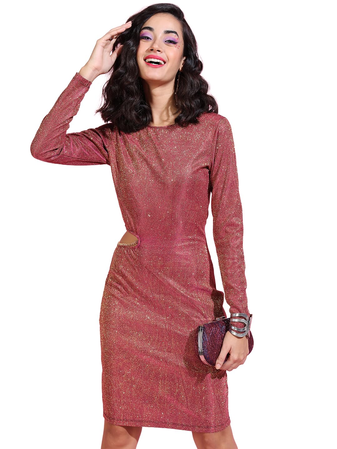 Tokyo Talkies Women Glamorous Shimmer Bodycon Short Dress | Side Cut-Out & Long Sleeves for a Bold, Sleek Look