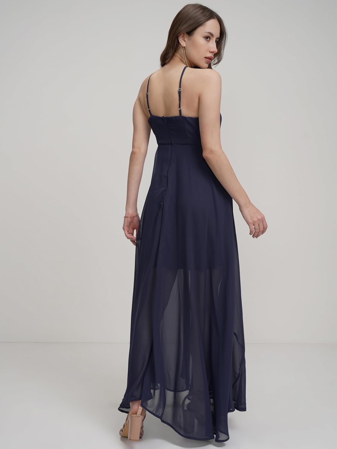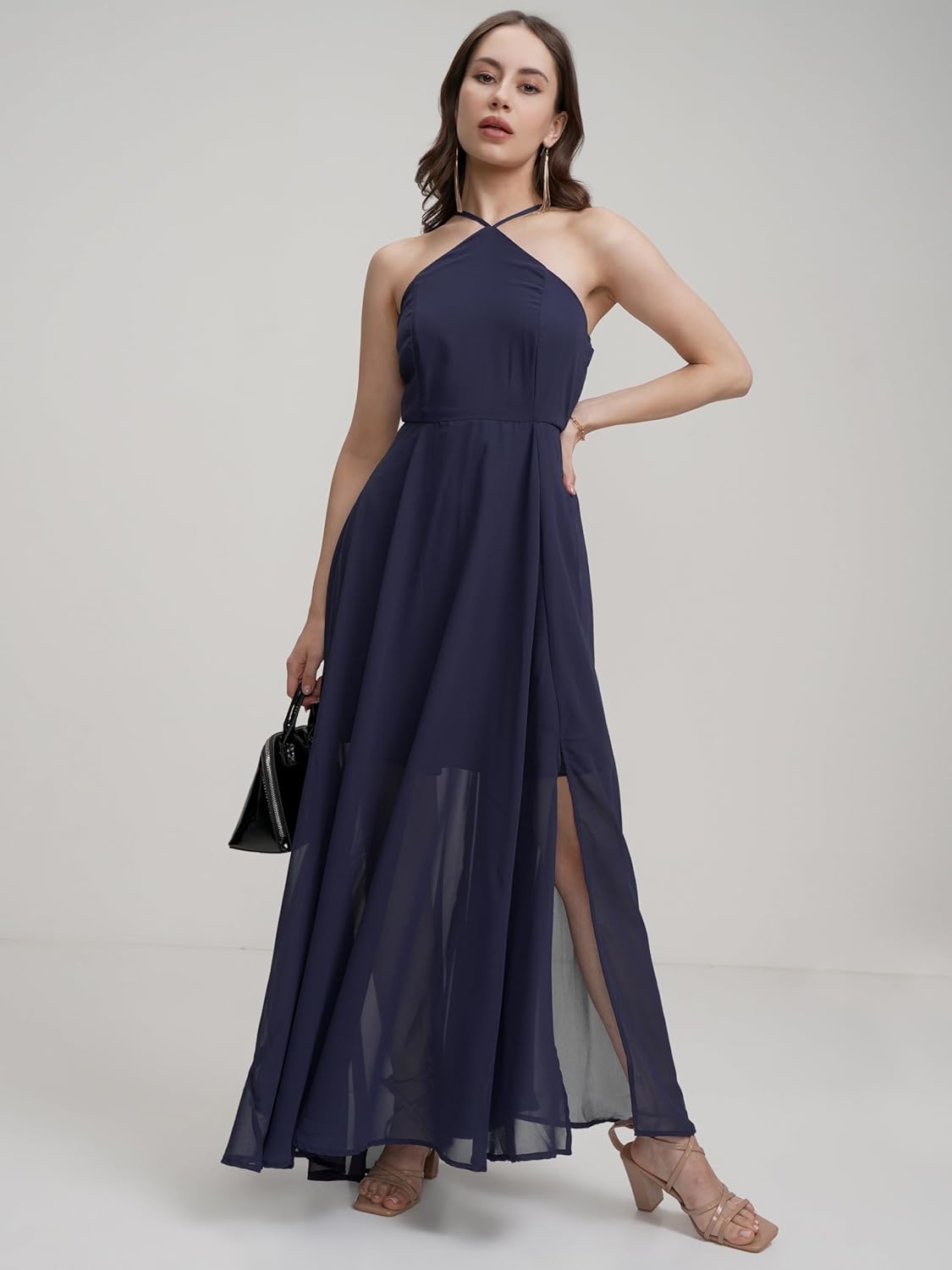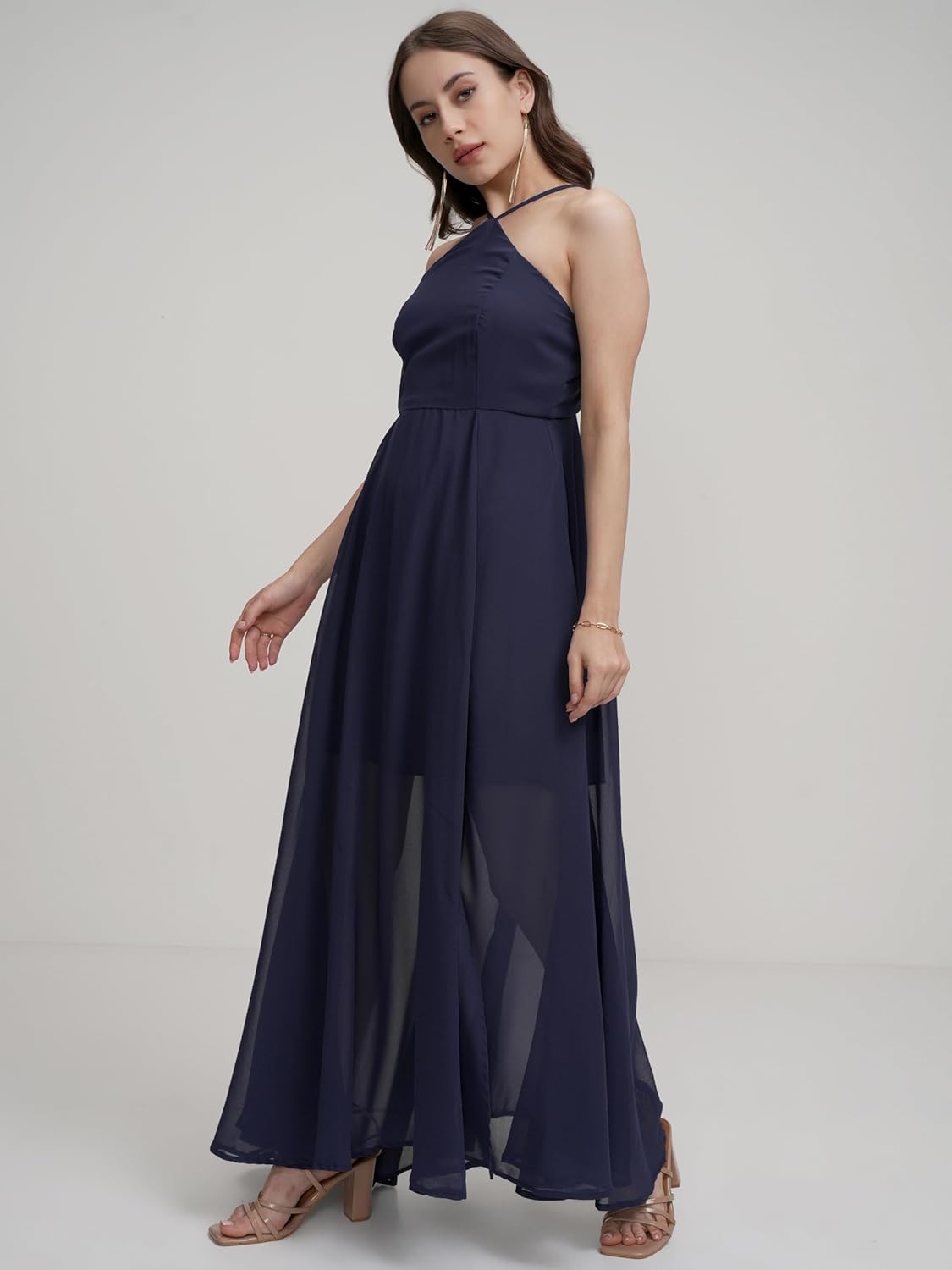 Tokyo Talkies Halter Neck Flowy Maxi Dress | Cinched Waist | Elegant & Airy Silhouette for a Breezy, Effortless Look