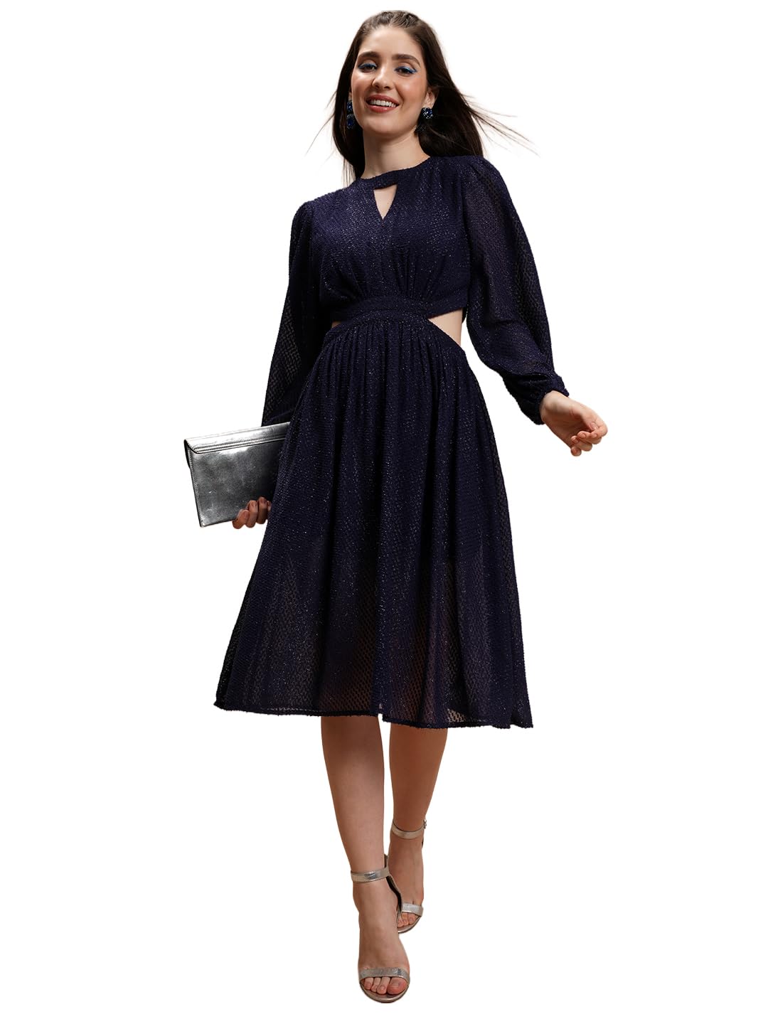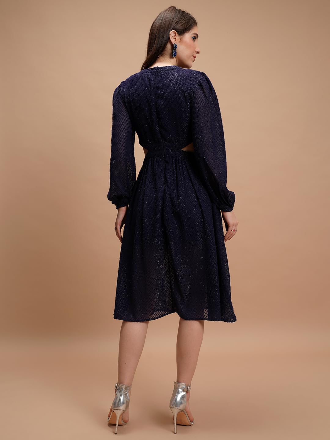Tokyo Talkies Navy Blue Self Design Cut Out Fit & Flare Midi Dress