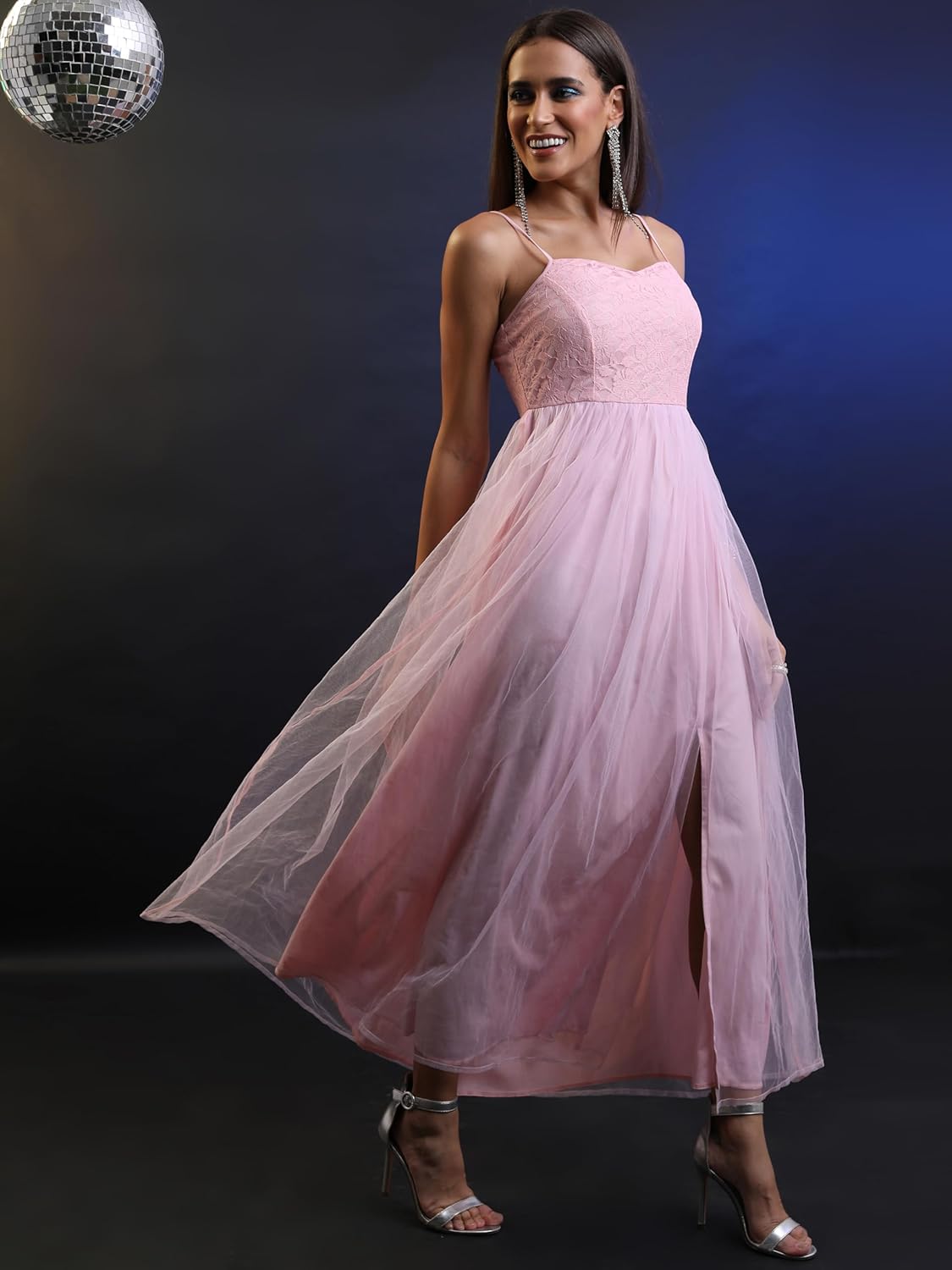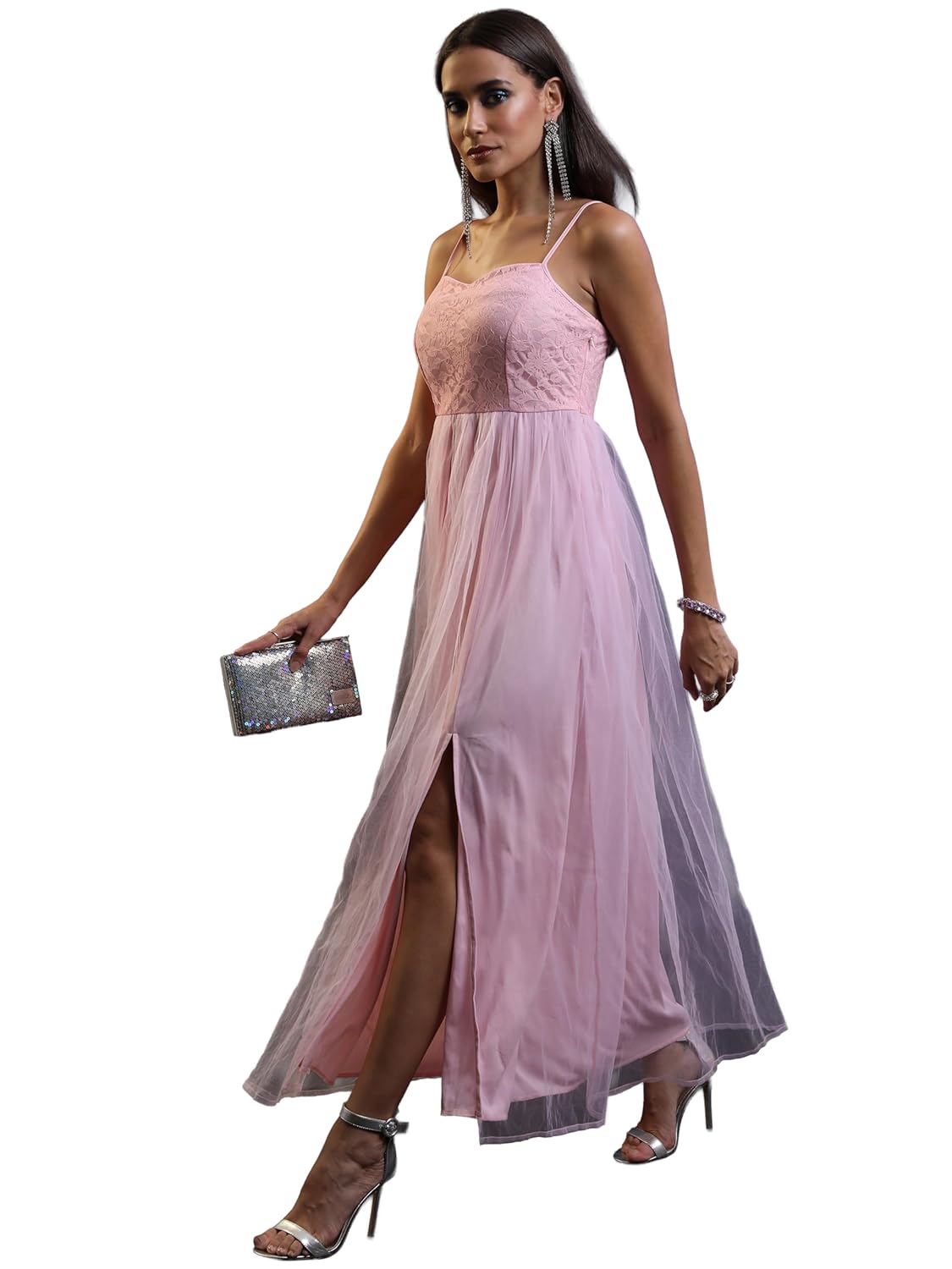 Tokyo Talkies Women Pink Lace Maxi Slit Dress