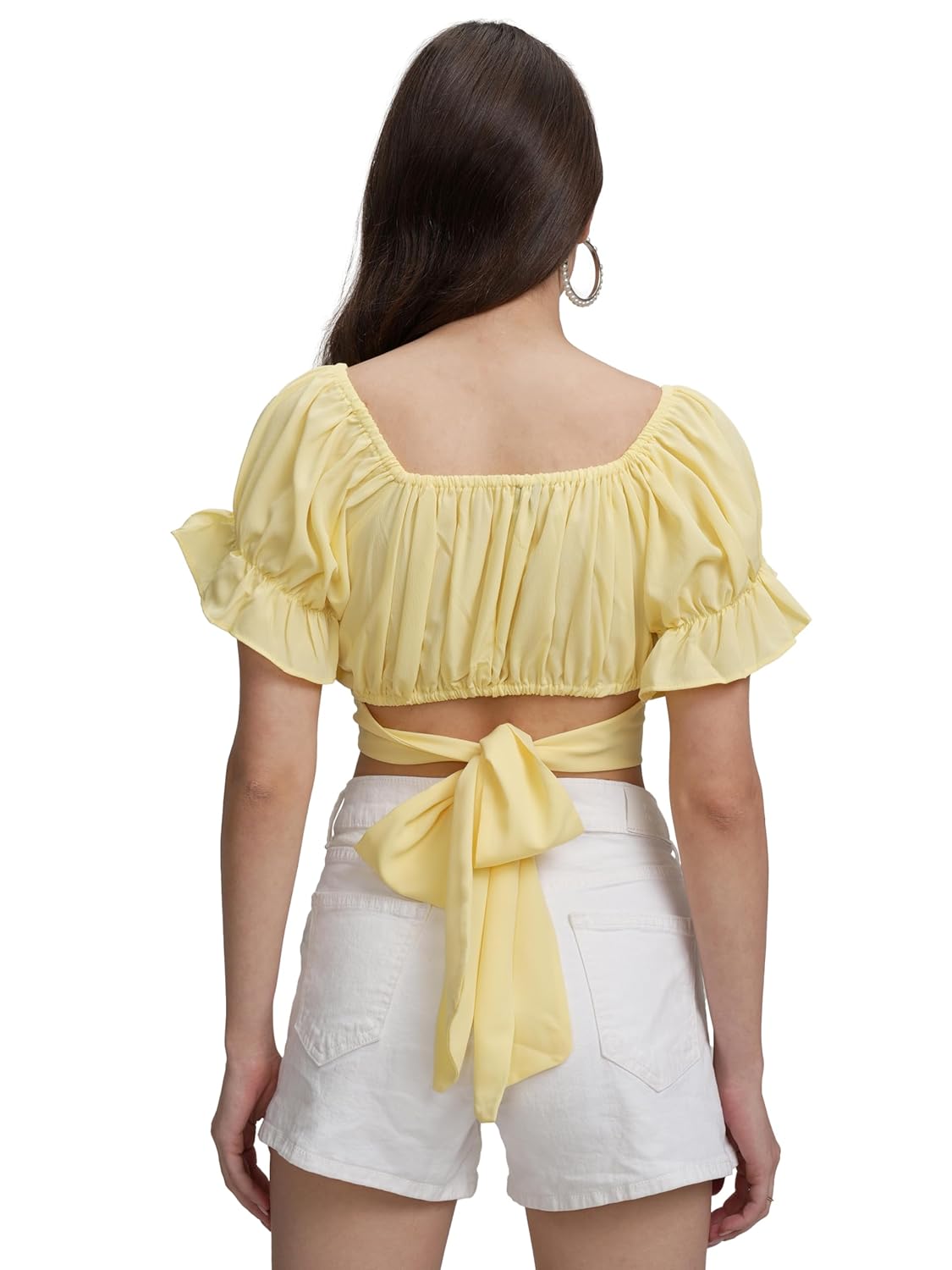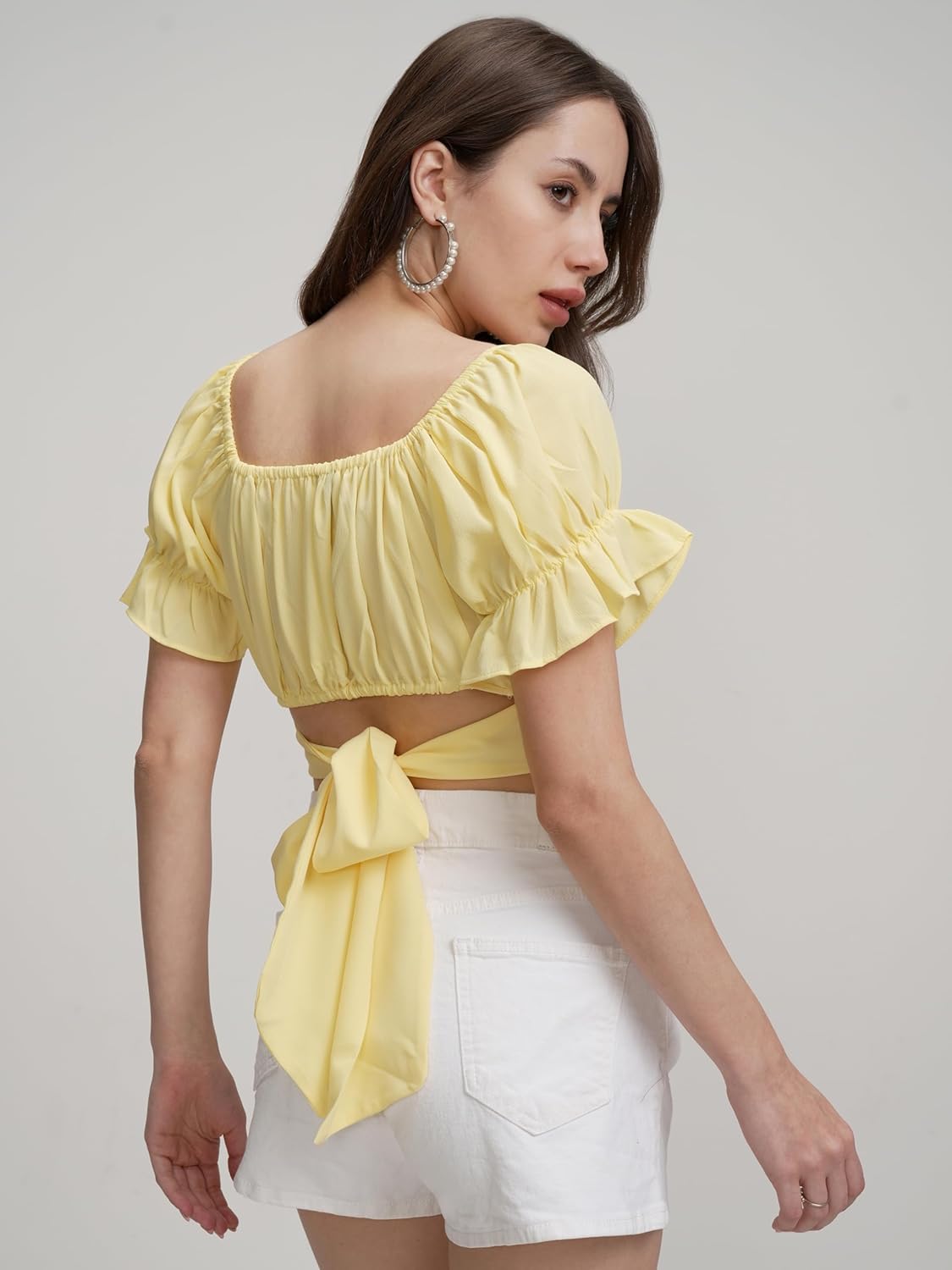 Tokyo Talkies Puff Sleeves Styled Back Crop Top | Cinched Waist | Feminine & Trendy | Perfect For Casual & Day Outings | Tops For Woman | Women Tops
