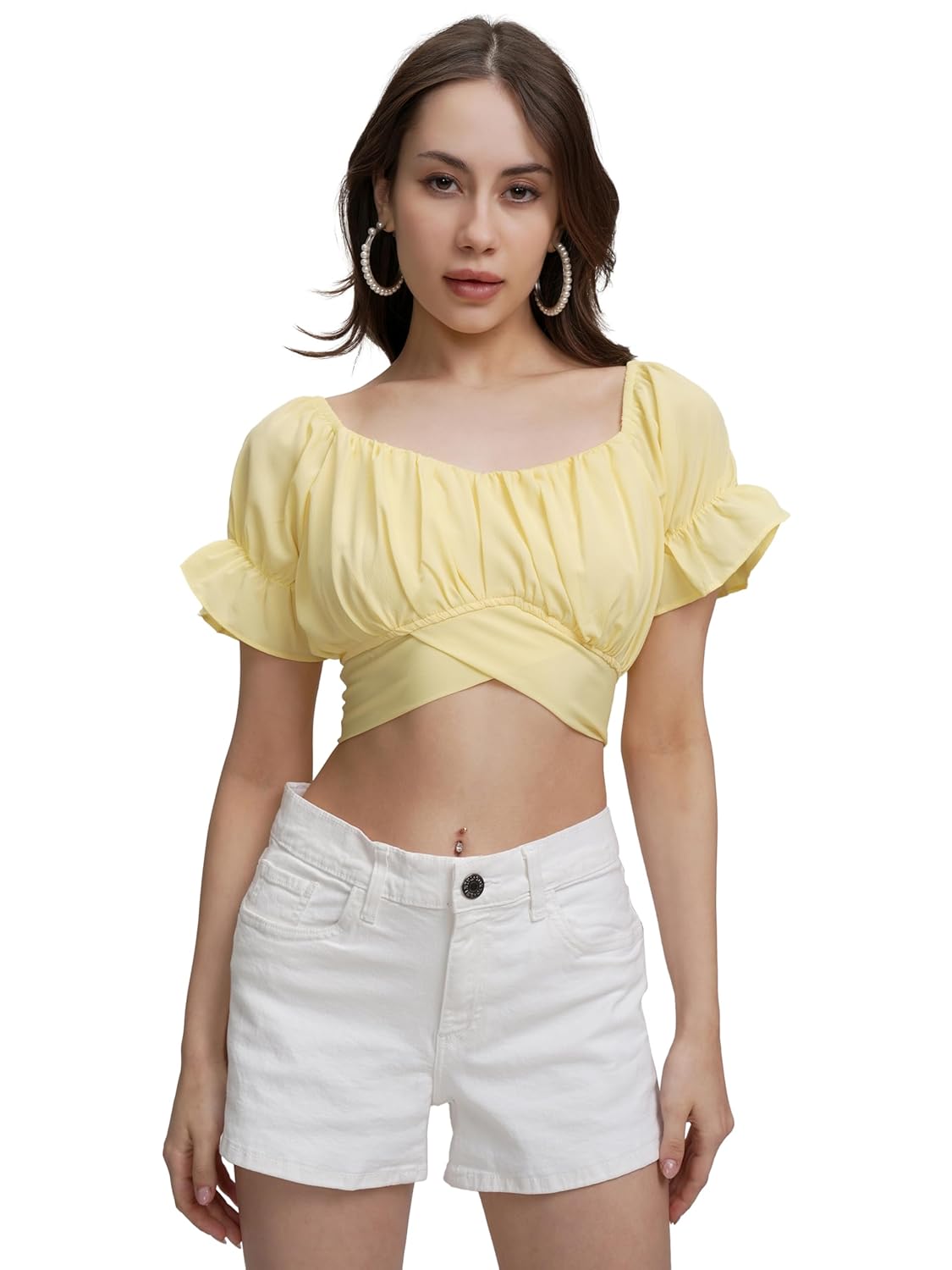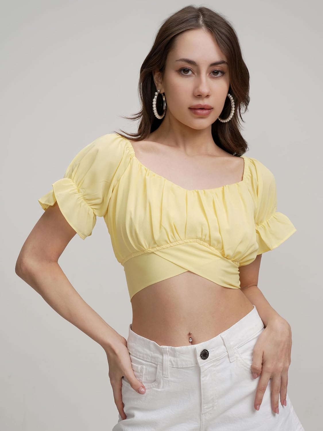 Tokyo Talkies Women’s Puff Sleeves Styled Back Crop Top | Cinched Waist | Feminine & Trendy | Perfect for Casual & Day Outings | Tops for Woman | Women Tops | Women Crop Top by Prixsa.com