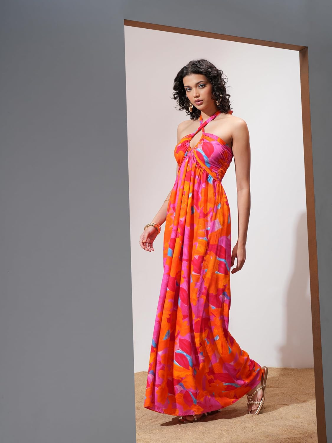 Tokyo Talkies Women Pink Multi Floral Tie Up Neck Vacay Maxi Dress