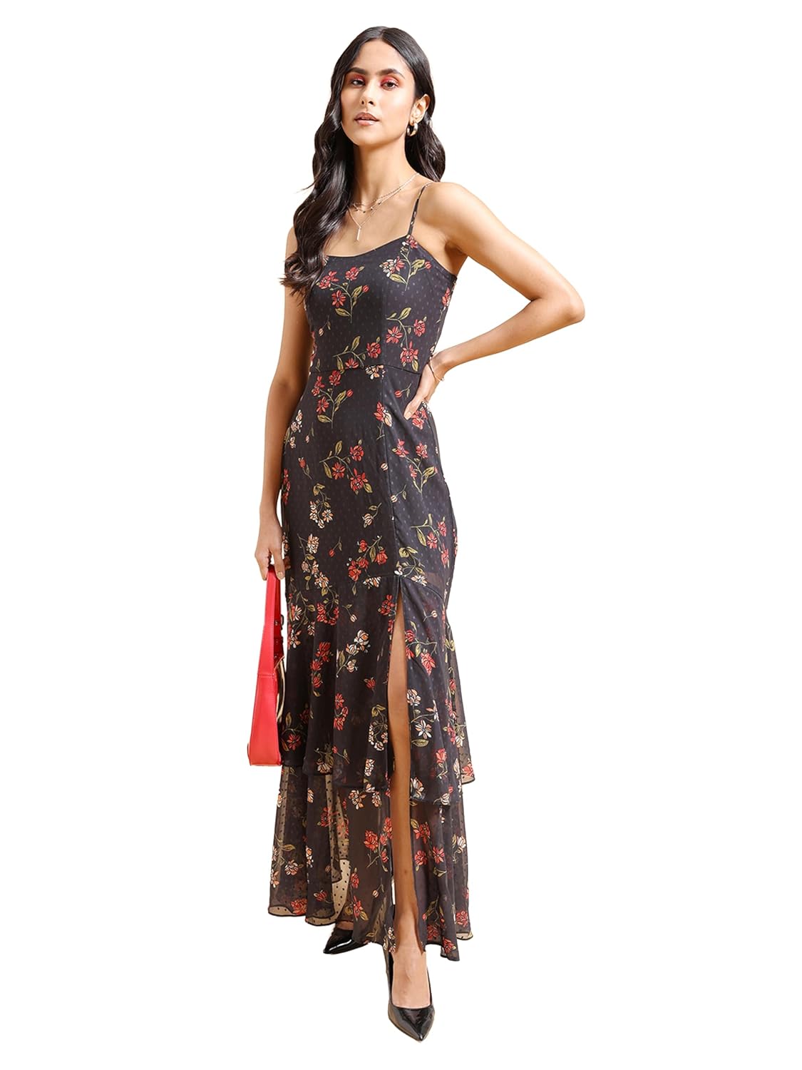 Tokyo Talkies Black & Red Floral Printed Shoulder Straps Layered Maxi Dress