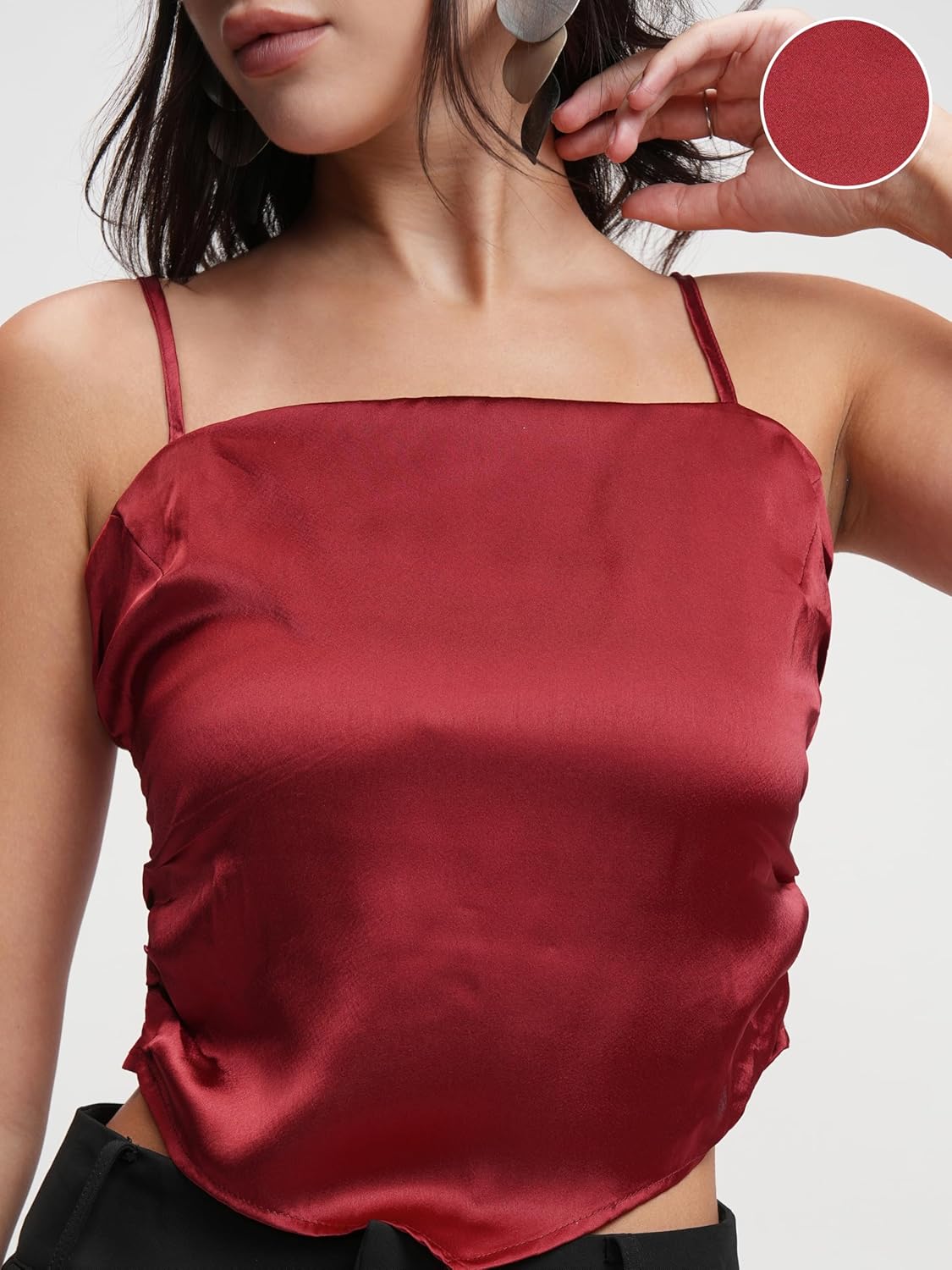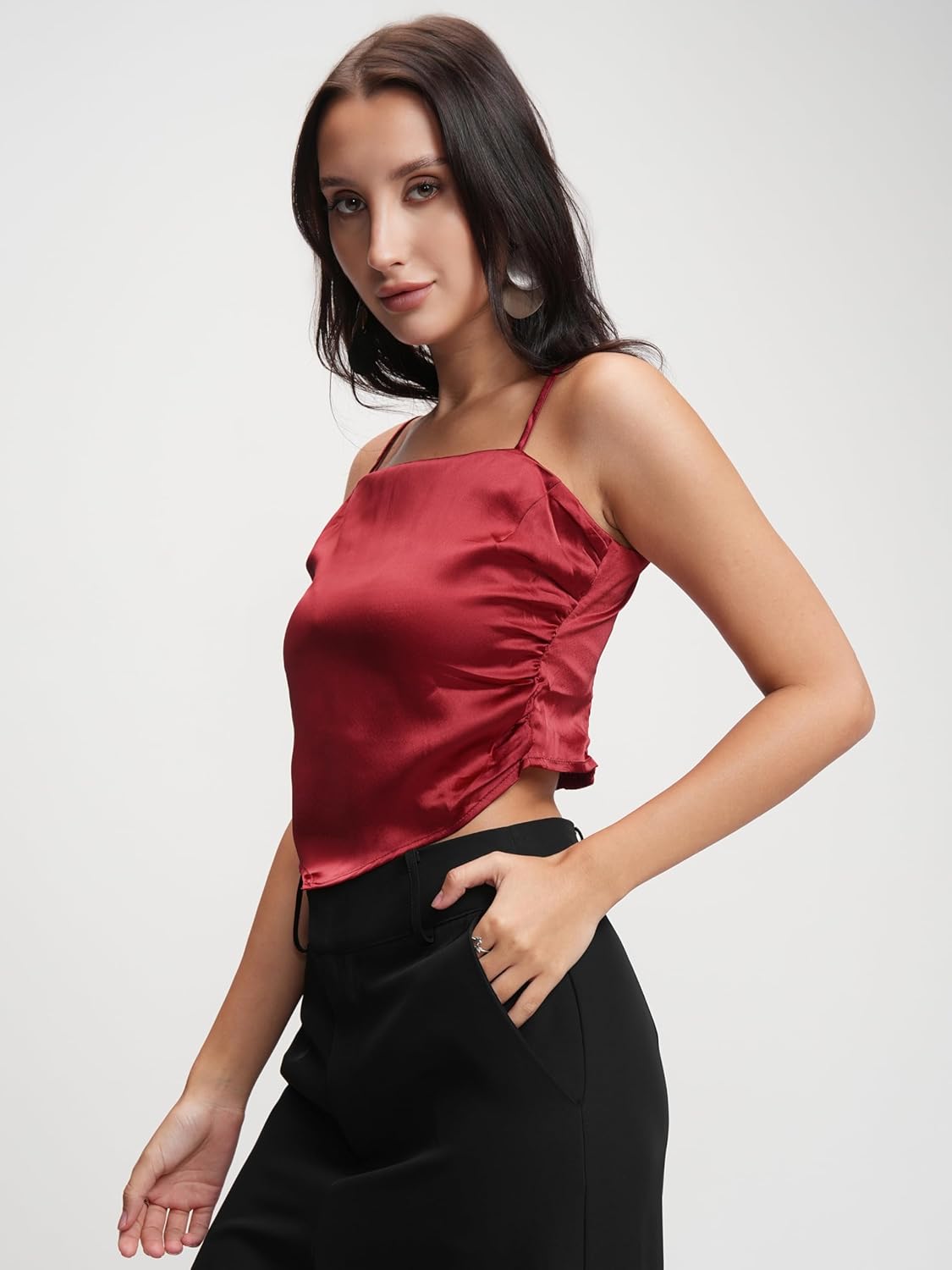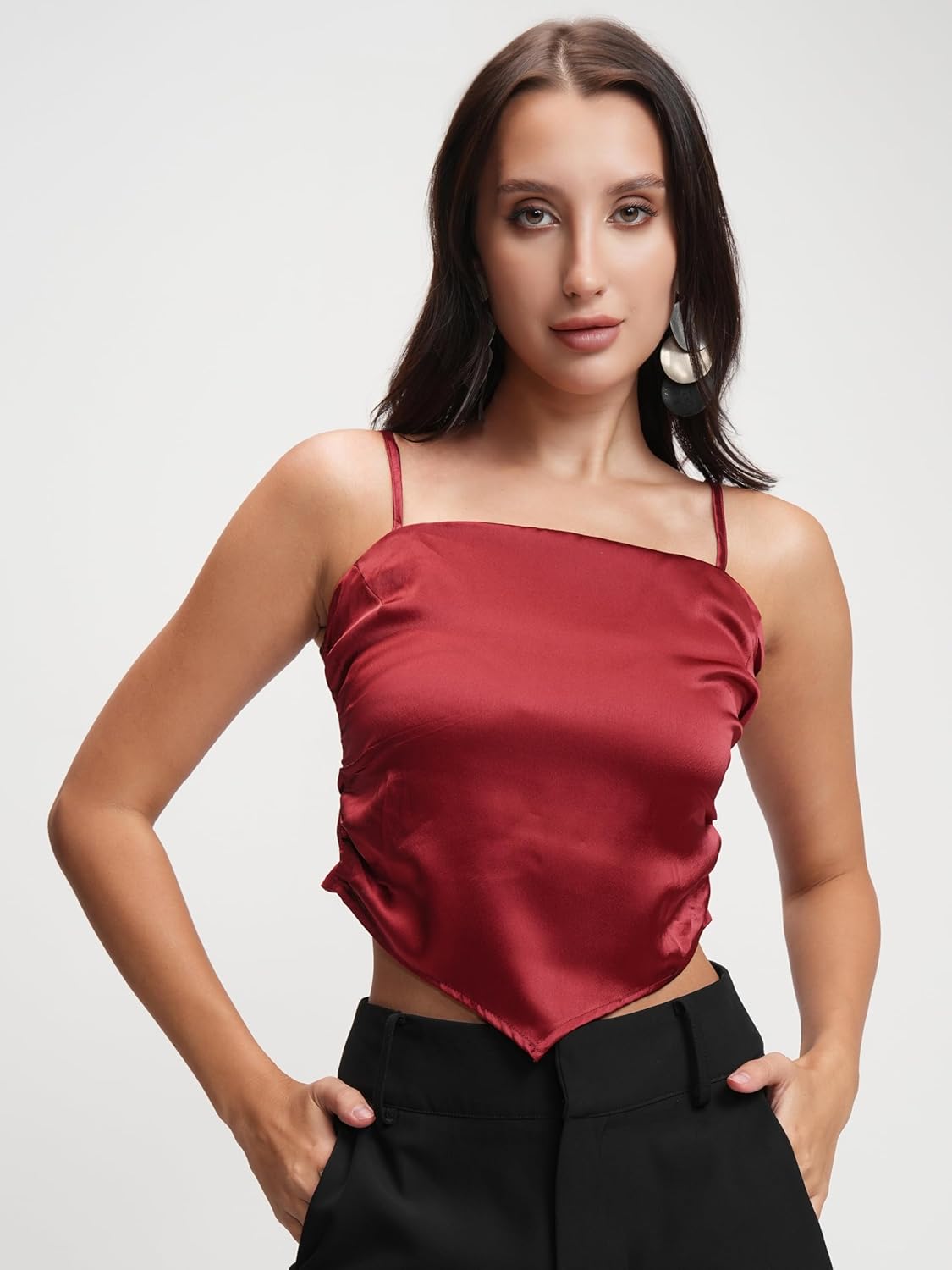 Tokyo Talkies Shoulder Strap Crop Top | Asymmetric Hem | Satin Finish | Chic & Elegant For Casual & Evening Looks | Tops For Woman | Women Tops