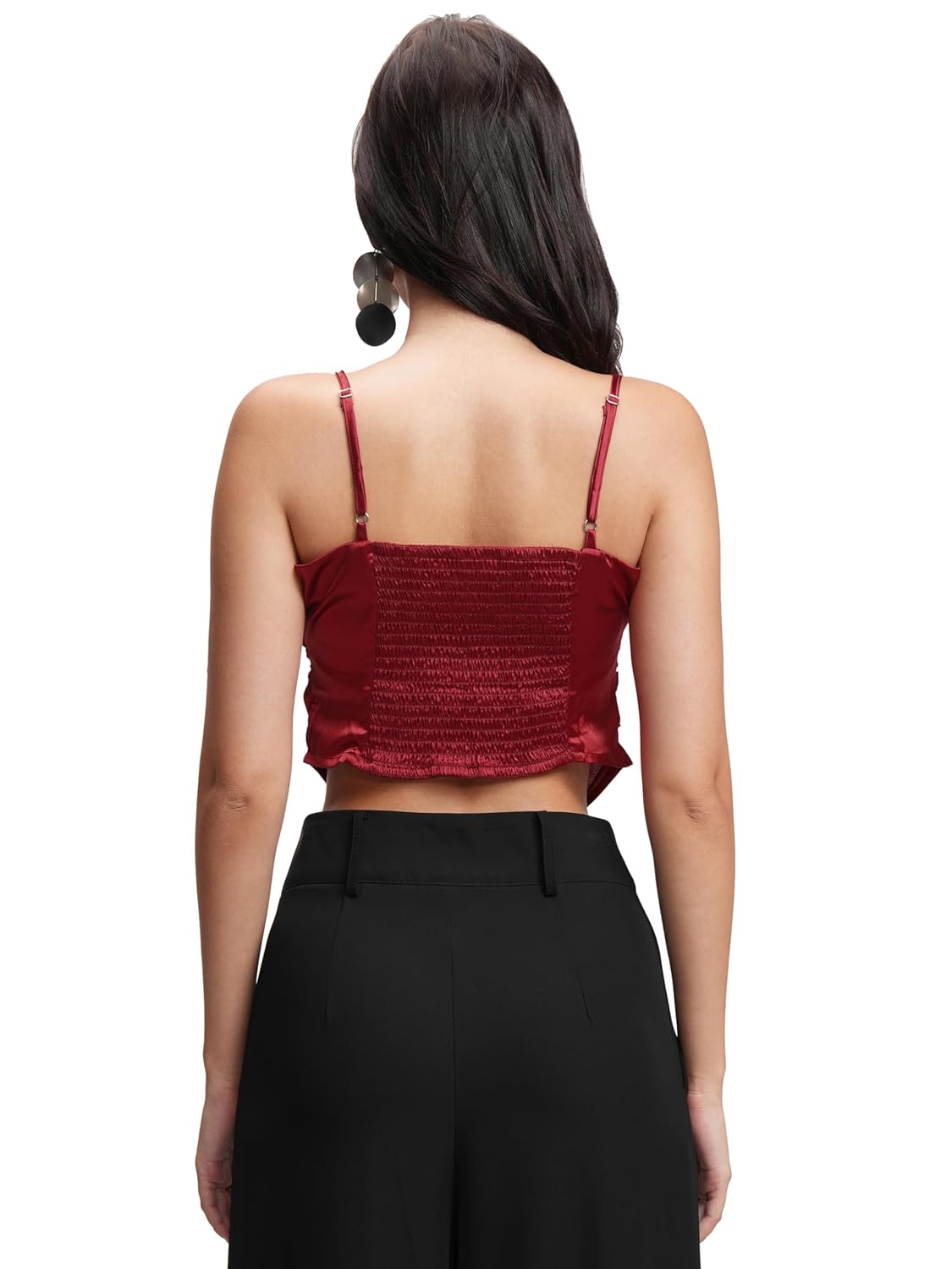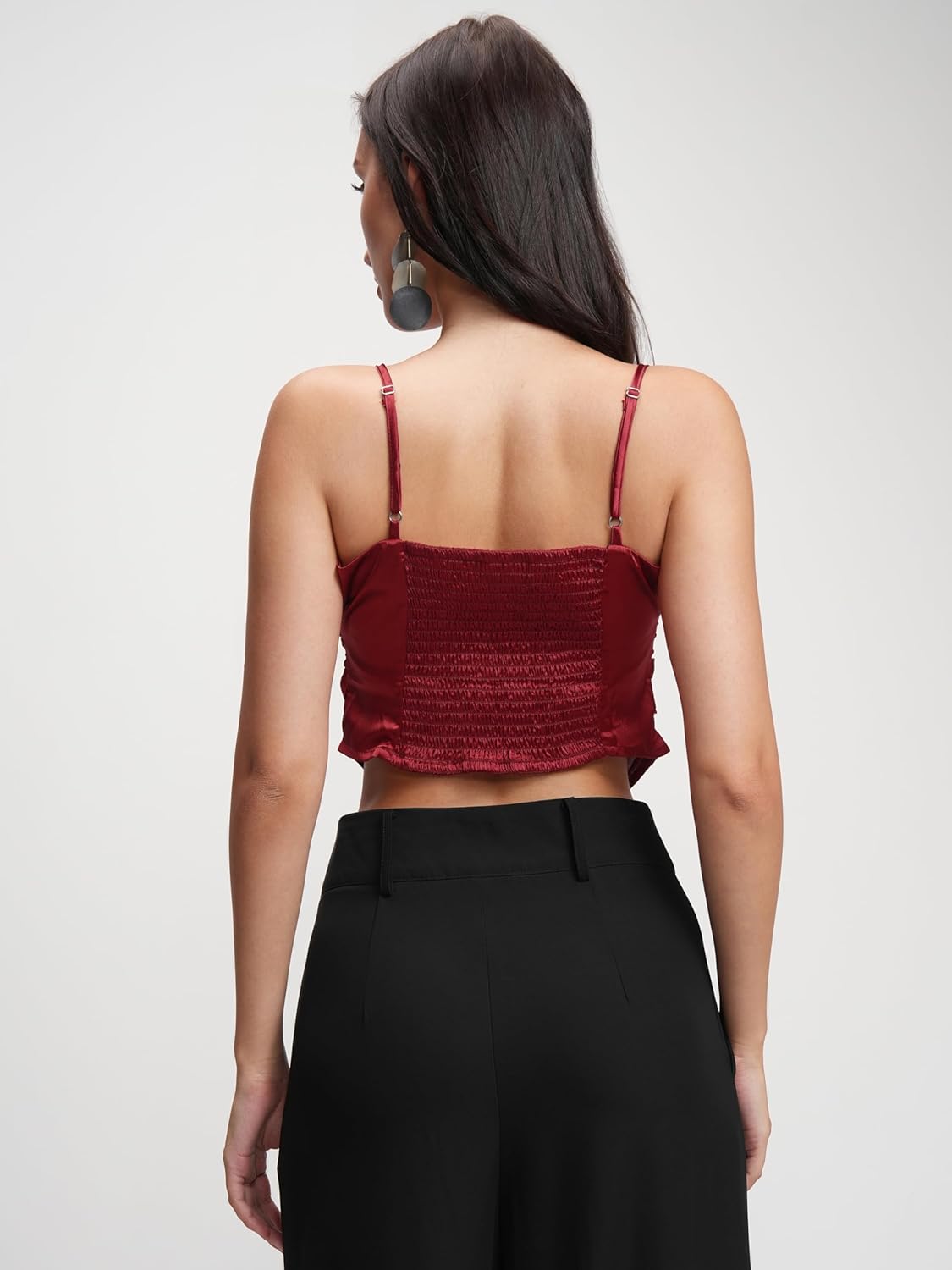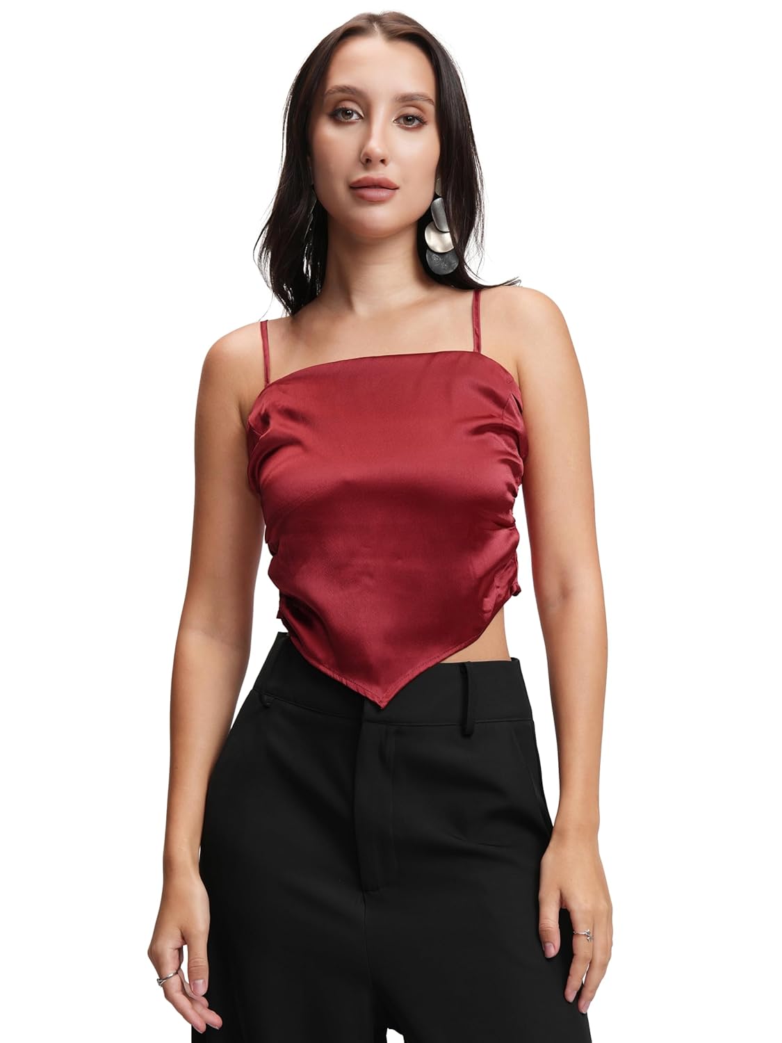Tokyo Talkies Shoulder Strap Crop Top | Asymmetric Hem | Satin Finish | Chic & Elegant For Casual & Evening Looks | Tops For Woman | Women Tops