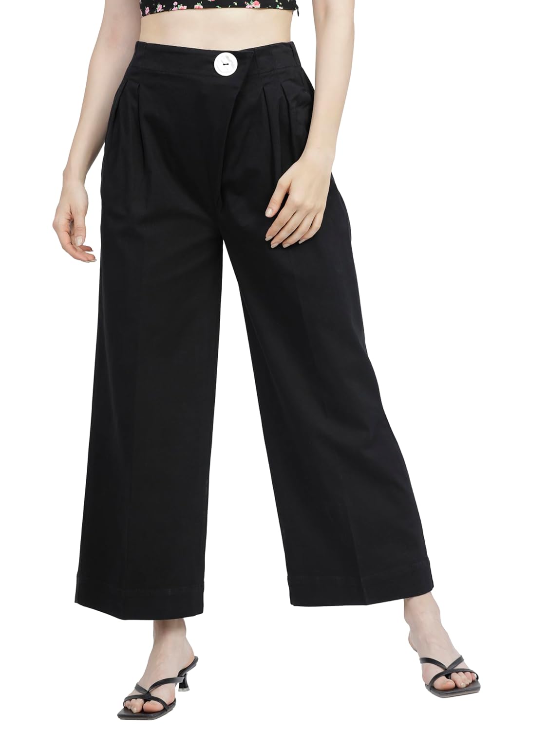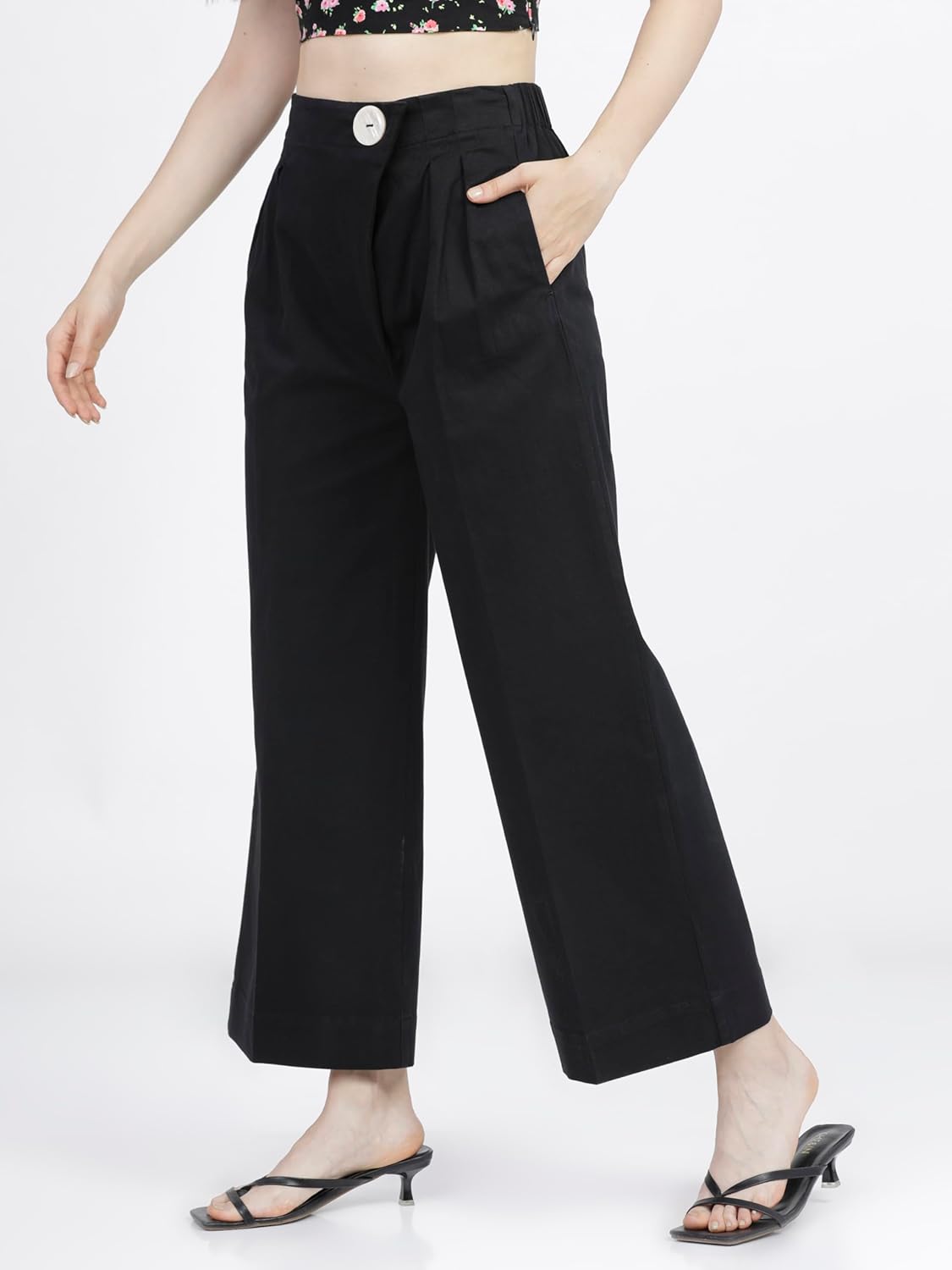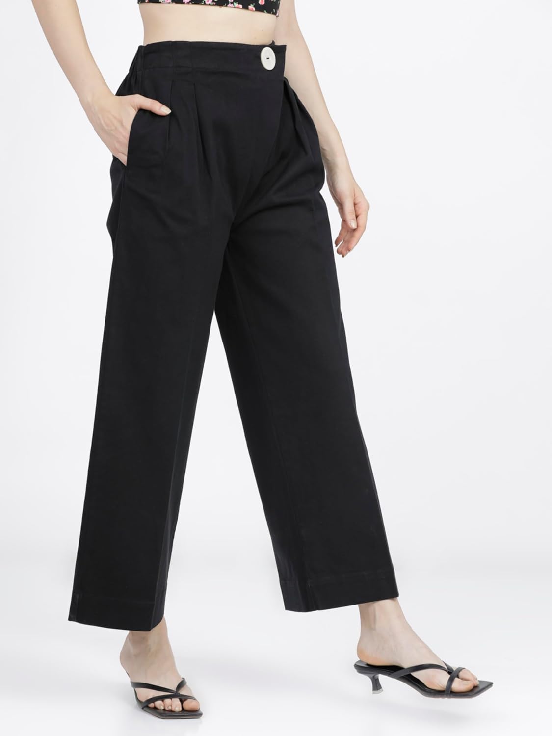 Tokyo Talkies Women Black High-Rise Pleated Parallel Trousers