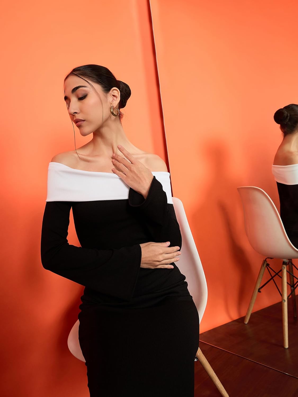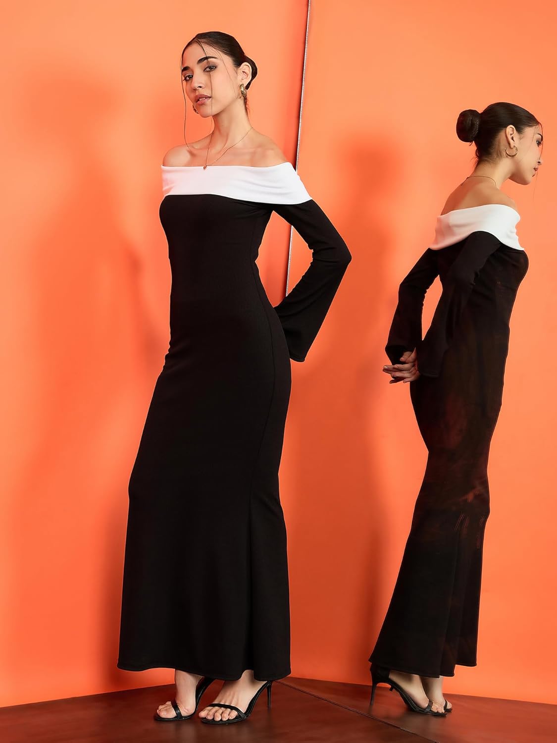 Make a striking statement with our Off Shoulder Bodycon Maxi Dress. This stunning piece showcases a sophisticated off-shoulder design that beautifully highlights your neckline and shoulders. The sleek bodycon silhouette hugs your curves, offering a flattering fit that exudes confidence.The bold black and white contrast adds a modern touch, making it perfect for both formal occasions and chic evenings out. Crafted from a comfortable, stretchy fabric, this dress ensures you can move with ease while looking effortlessly stylish. Available in a range of sizes, it’s designed to make every woman feel confident and outstanding.