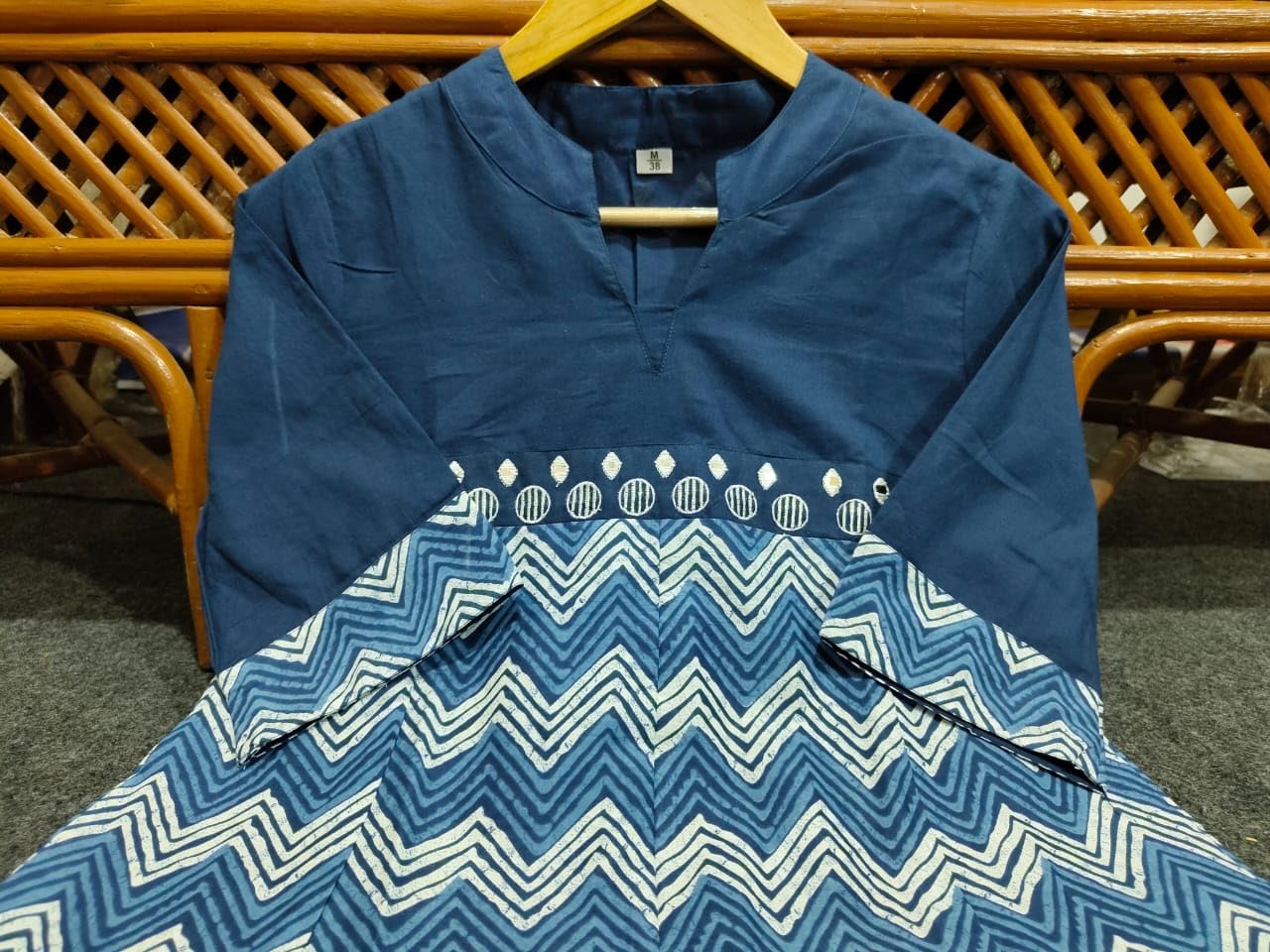 Make a graceful statement with this elegant cotton gown featuring a sophisticated blue chevron print pattern. The dress showcases a thoughtfully designed mandarin collar that adds a touch of contemporary style. The 3/4 sleeve length offers versatile comfort across seasons, while the flowing silhouette ensures ease of movement throughout the day. The striking zigzag pattern in varying shades of blue creates a mesmerising visual effect that’s both modern and timeless. Crafted from cotton fabric, this gown provides excellent breathability and comfort for daily wear. The mandarin collar adds structure to the neckline, whilst the overall design strikes a perfect balance between casual and formal wear. Perfect for both everyday occasions and special gatherings, this gown can be accessorised differently to create multiple looks. The knee-length cut and relaxed fit make it a versatile addition to your wardrobe.