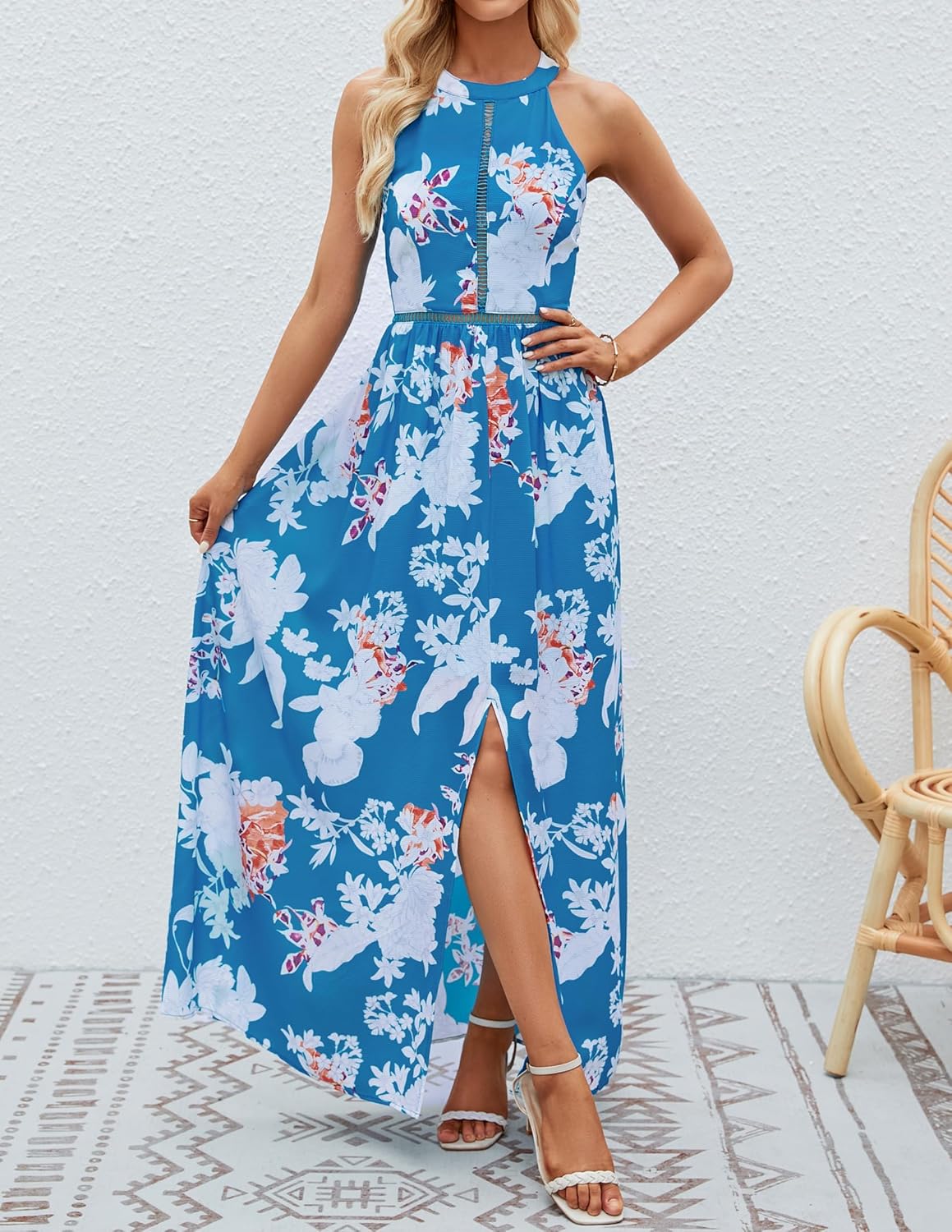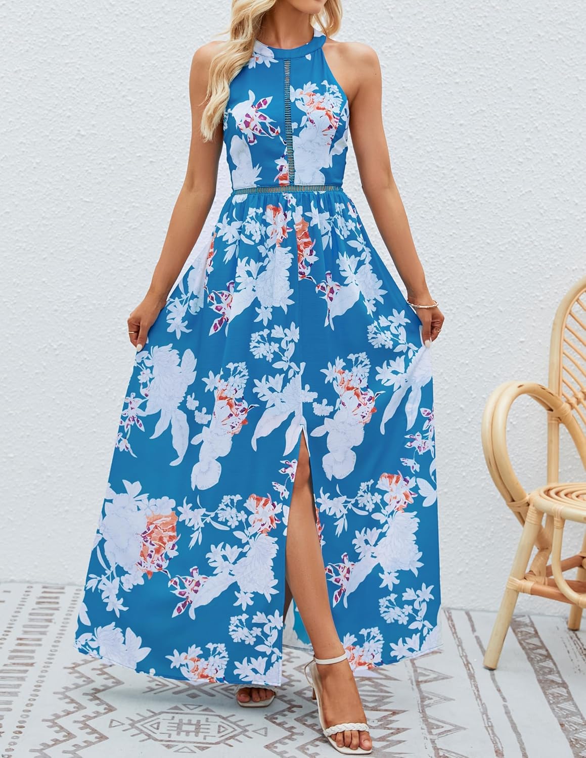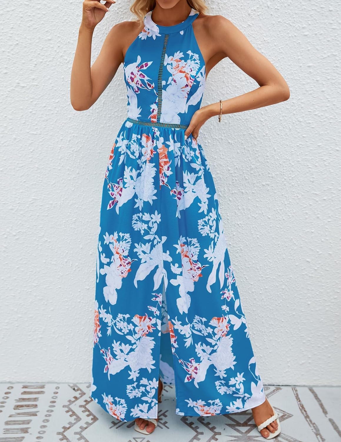 ZESICA Women’s Halter Neck Floral Print Backless Split Beach Party Maxi Dress, Teal, Large by Prixsa.com