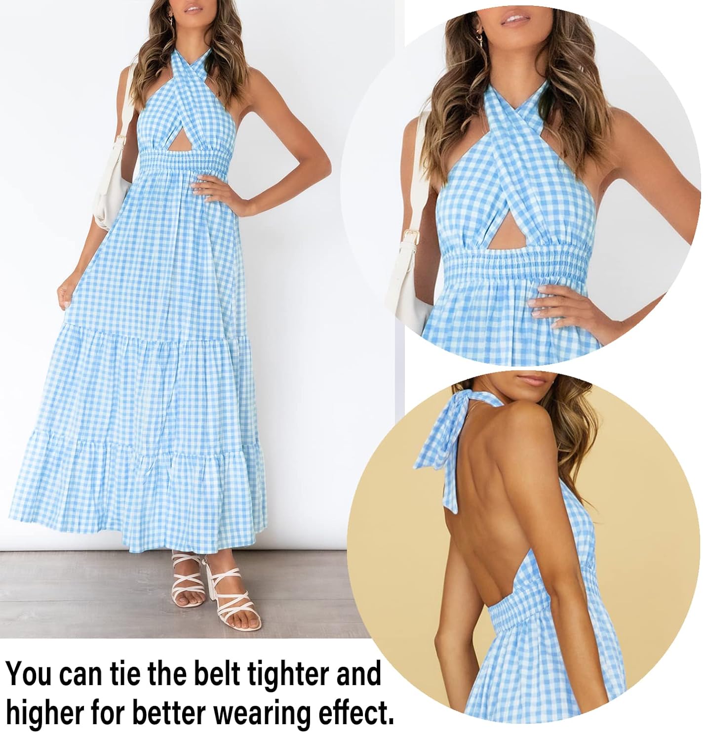 ZESICA Women’s Summer Crossover Halter Neck Sleeveless Plaid Cut Out Backless Flowy A Line Maxi Dress, Blue, Medium by Prixsa.com