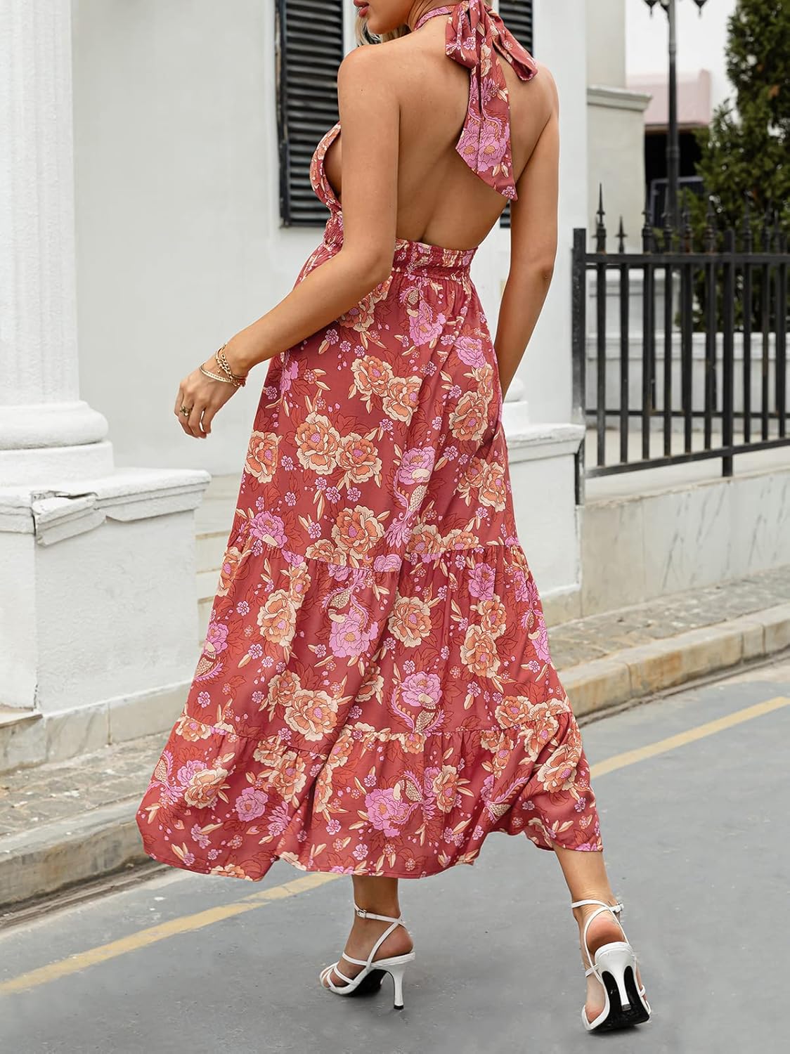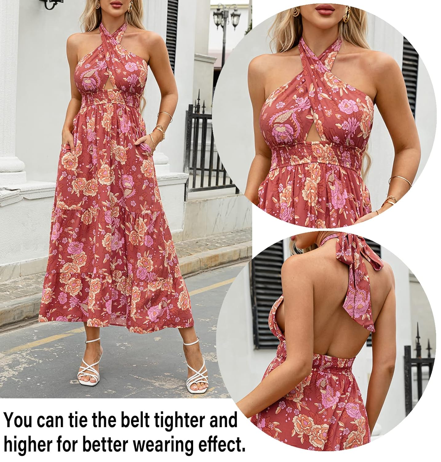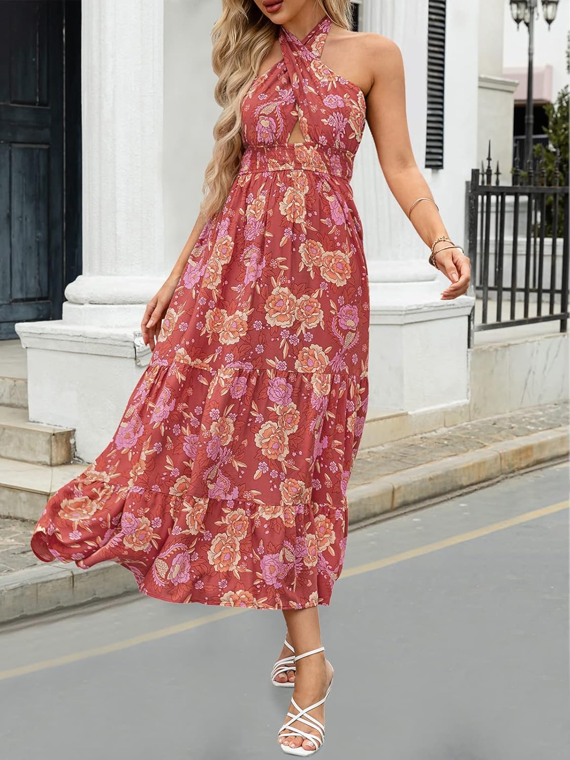 ZESICA Women’s Summer Crossover Halter Neck Sleeveless Plaid Cut Out Backless Flowy A Line Maxi Dress, Burntbrick, Large by Prixsa.com
