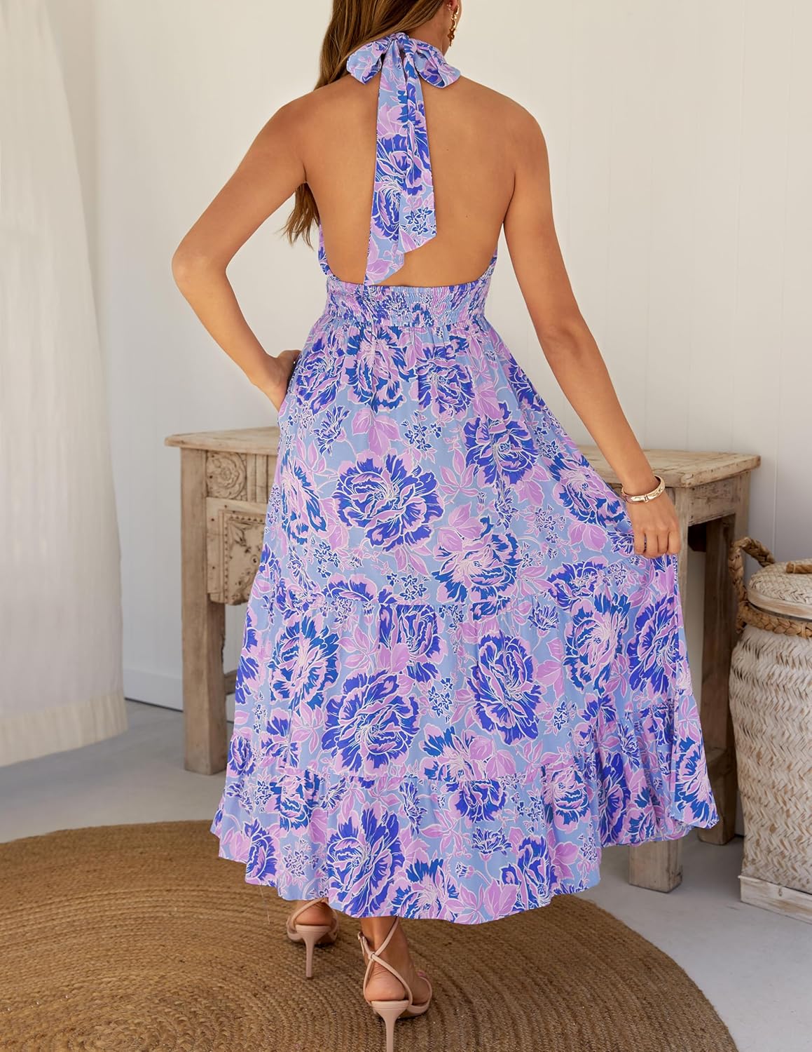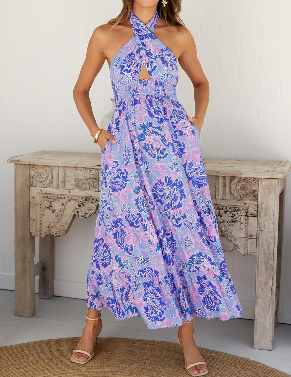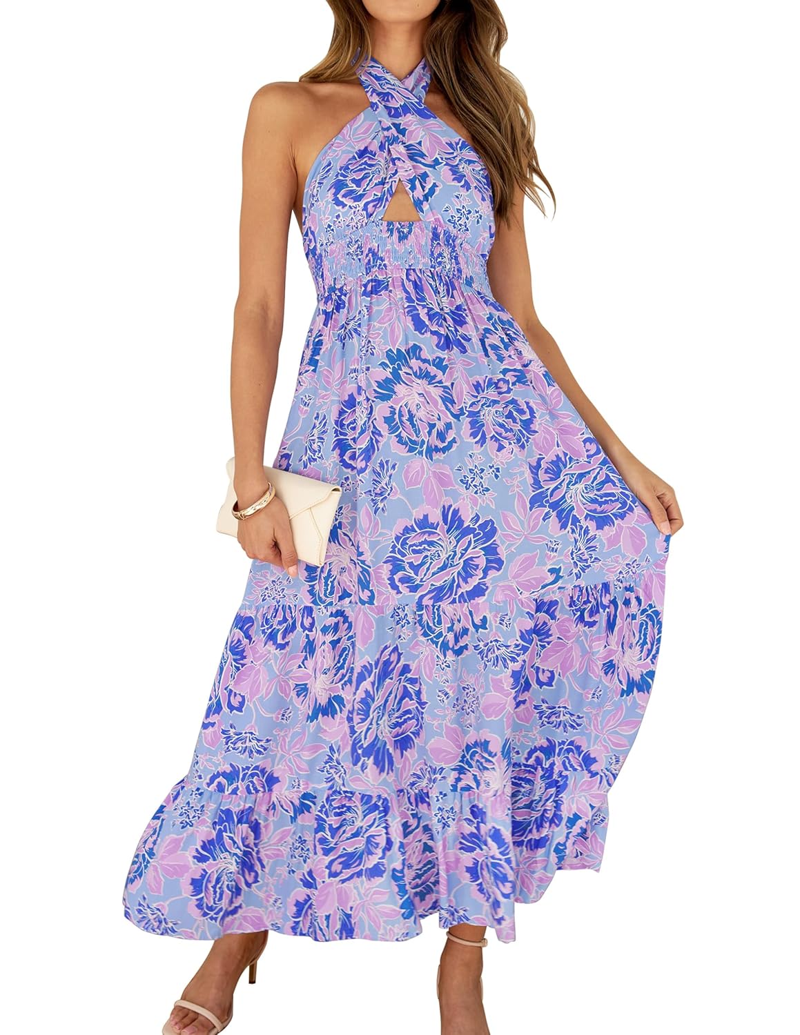 ZESICA Women’s Summer Crossover Halter Neck Sleeveless Plaid Cut Out Backless Flowy A Line Maxi Dress by Prixsa.com