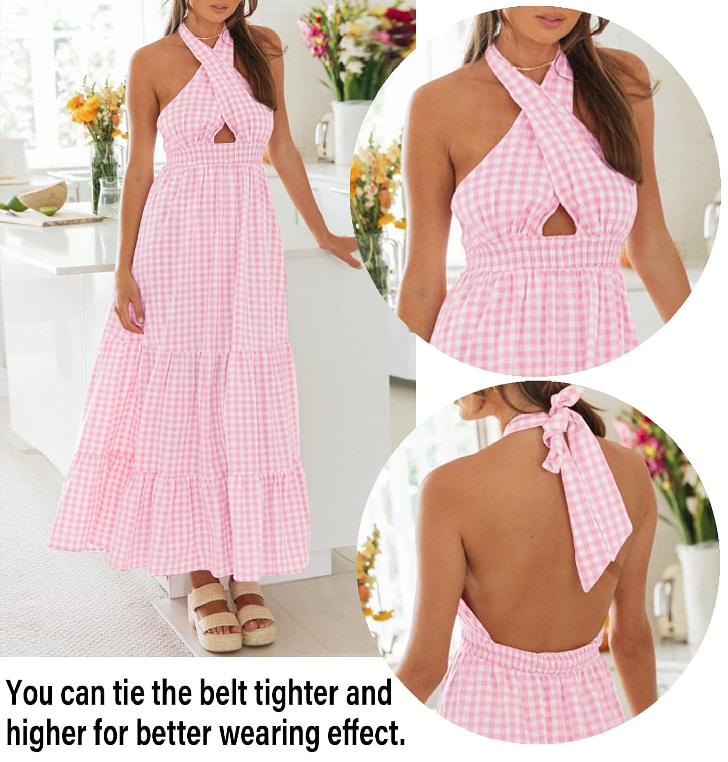 ZESICA Women’s Summer Crossover Halter Neck Sleeveless Plaid Cut Out Backless Flowy A Line Maxi Dress, Pink, Large by Prixsa.com
